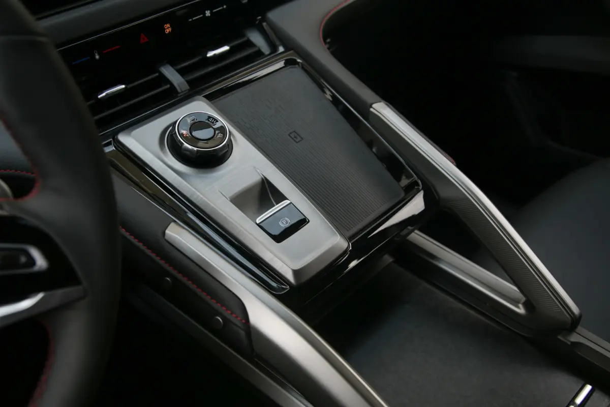 A két ülés között vezeték nélküli telefontöltő, az automata kézifék kapcsolója, illetve a hajtás tekerőgombja kapott helyet