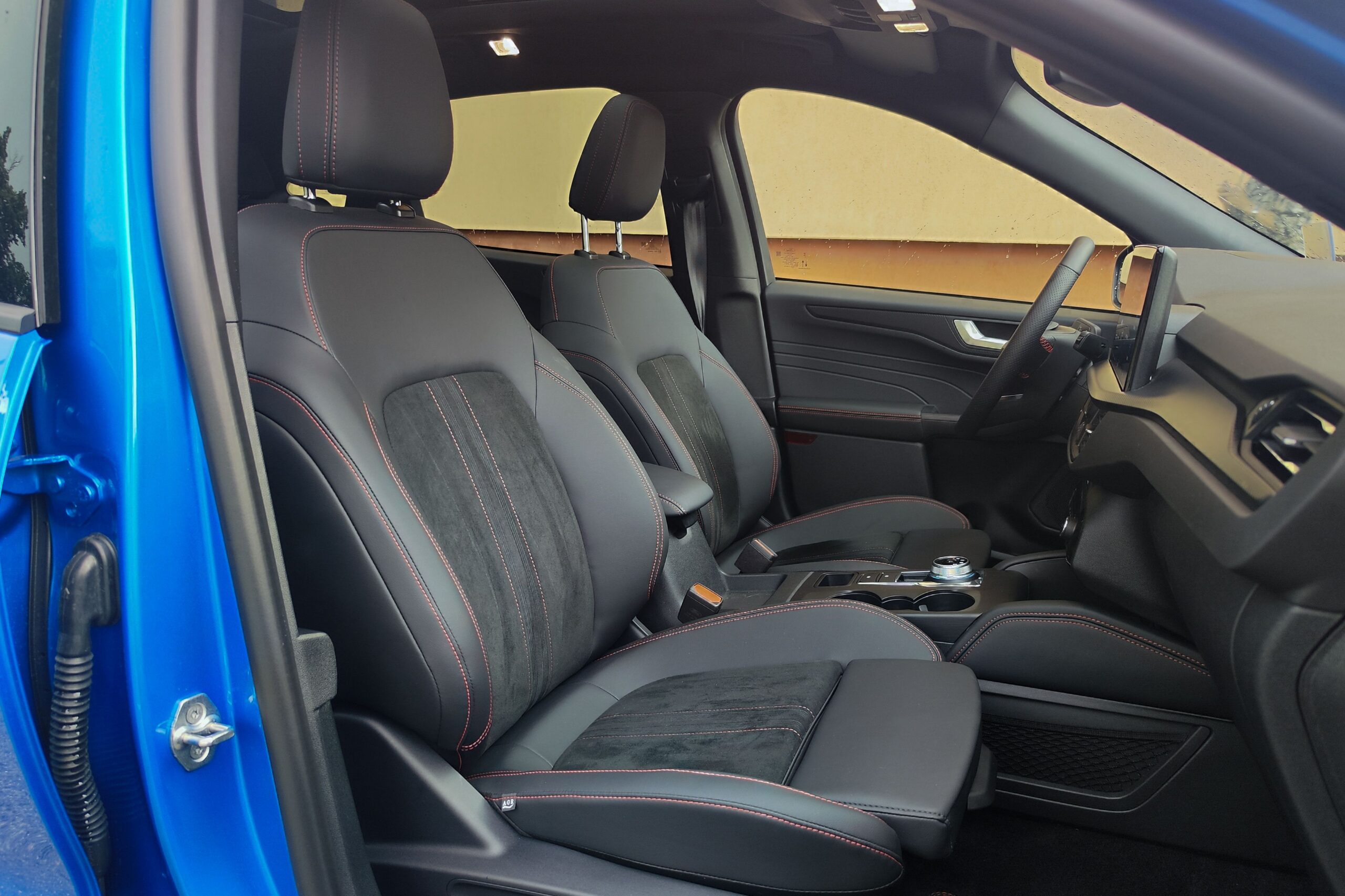 Bent ugyancsak a divatnak engedve nagyobb érintőképernyőt kapott az infotainment rendszer, száműzték a klíma fizikai gombjait (ami szerintem hiba volt), meg úgy nagy általánosságban majdnem minden nyomógombot eltüntettek. Szerencsére a SYNC 4 multimédiás rendszer egyszerűen használható, könnyű benne eligazodni, még úgy is, hogy továbbra sem tud magyarul. Az anyaghasználat a kategóriára jellemző átlagot hozza, ami annyit jelent, hogy kellemes tapintásúak úgy a puha, mint a keményebb műanyagok is. Sokak örömére a zongoralakk használatát is kerülték. A kormány kialakítása profi, a karima vastagsága megfelelő, a gombok itt is egyértelműek, ezekkel lehet a digitális műszeregységben matatni. A legkellemesebb változás azonban a kényelmesebb ülések alkalmazása. A korábbi Kugák gyenge pontja a nem megfelelően párnázott és kialakított ülések voltak. Most már jól tartanak derékban is combnál is. Emellett igényes az ST Line felszereltségnél a kétféle műbőr alkalmazása és látványos a vörös cérna. Hátul pedig hasznos az ülések előre-hátra mozgathatósága, így a csomagtér is több fokozatban növelhető, amely alapból 412 literes és legfeljebb másfél köbméteresre bővülhet.