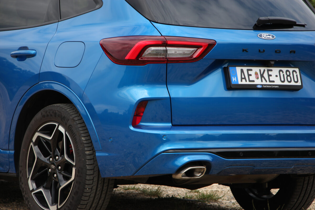 Oldalról nézve az ST Line sajátossága, hogy fényezettek a kerékjárati toldatok, illetve a könnyűfém felnik is a sportosságot hivatottak hangsúlyozni. A tesztautó 19 colos felnijeire szerencsére kellőképp ballonos gumiabroncsok kerültek, így a nagy méret nem ment a kényelem rovására, de mindjárt kitérek arra is, hogy milyen a futómű hangolása. Előtte azonban még egy gyors pillantás hátra, ahol kevesebb a változás. Új rajzolatot kaptak a hátsó fények, eltűnt a csomagtérnyitó kallantyú (helyette gombot alkalmaznak) és kb. ennyi. Viszont megmaradtak a valódi kipufogóvégek… halleluja!