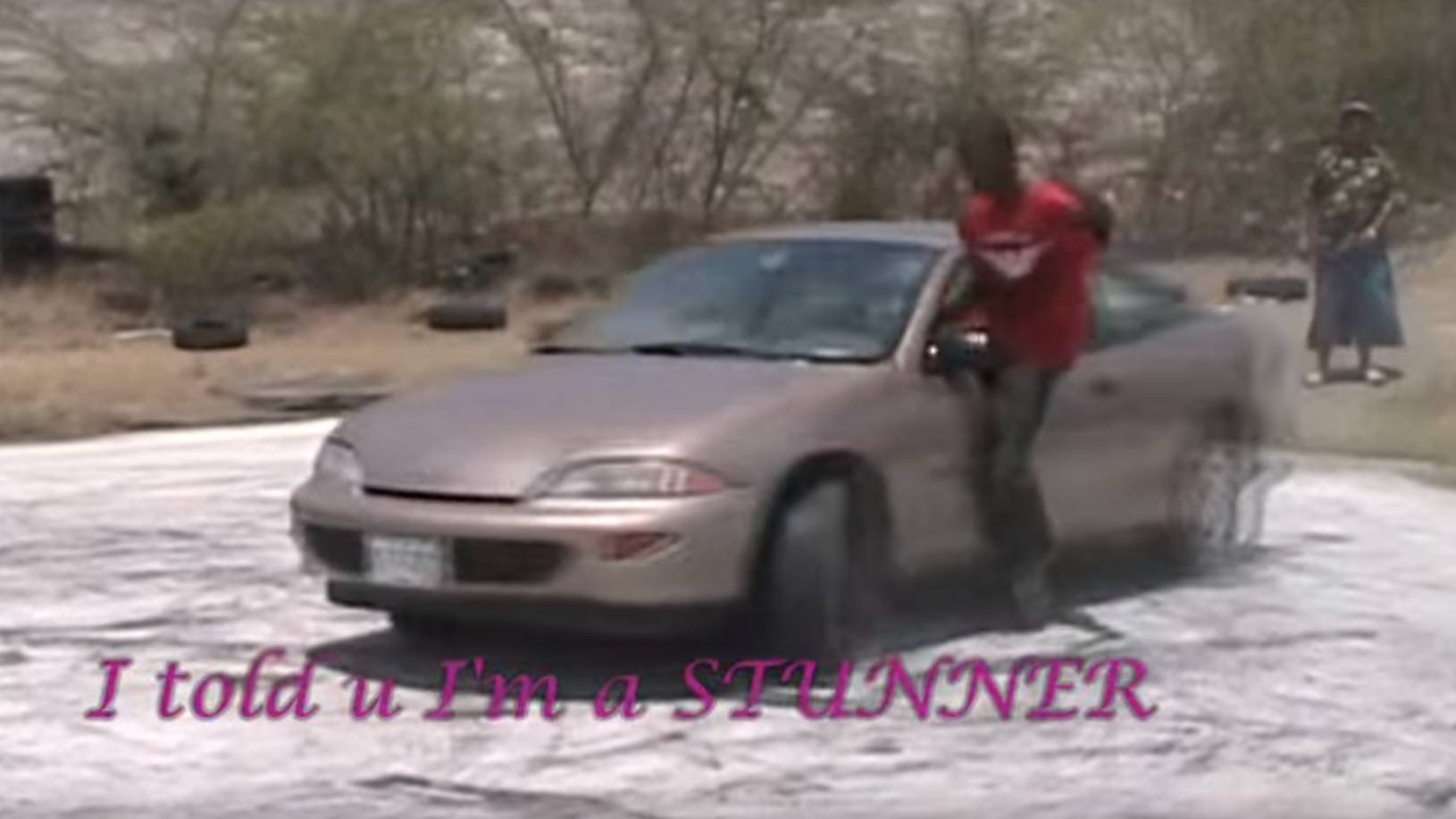 Nagyon unatkozhatott ez a srác, hisz a történetnek olyan videót is kerített, amit megkönnyeztünk, annyira csodálatos. Persze, ez csak szín tiszta irónia, de mégis, két fém hordófedél csodás mókává változtat még egy olyan hitvány és unalmas járművet is, mint ez az 1995-ös Chevrolet Cavalier. Hősünk annyira bátor és annyira kaszkadőrnek érzi magát, hogy a szórakozás hevében még az ablakba is kiül rodeózni, hogy úgy ülje meg a vasat, ahogy egy bikát szokás.