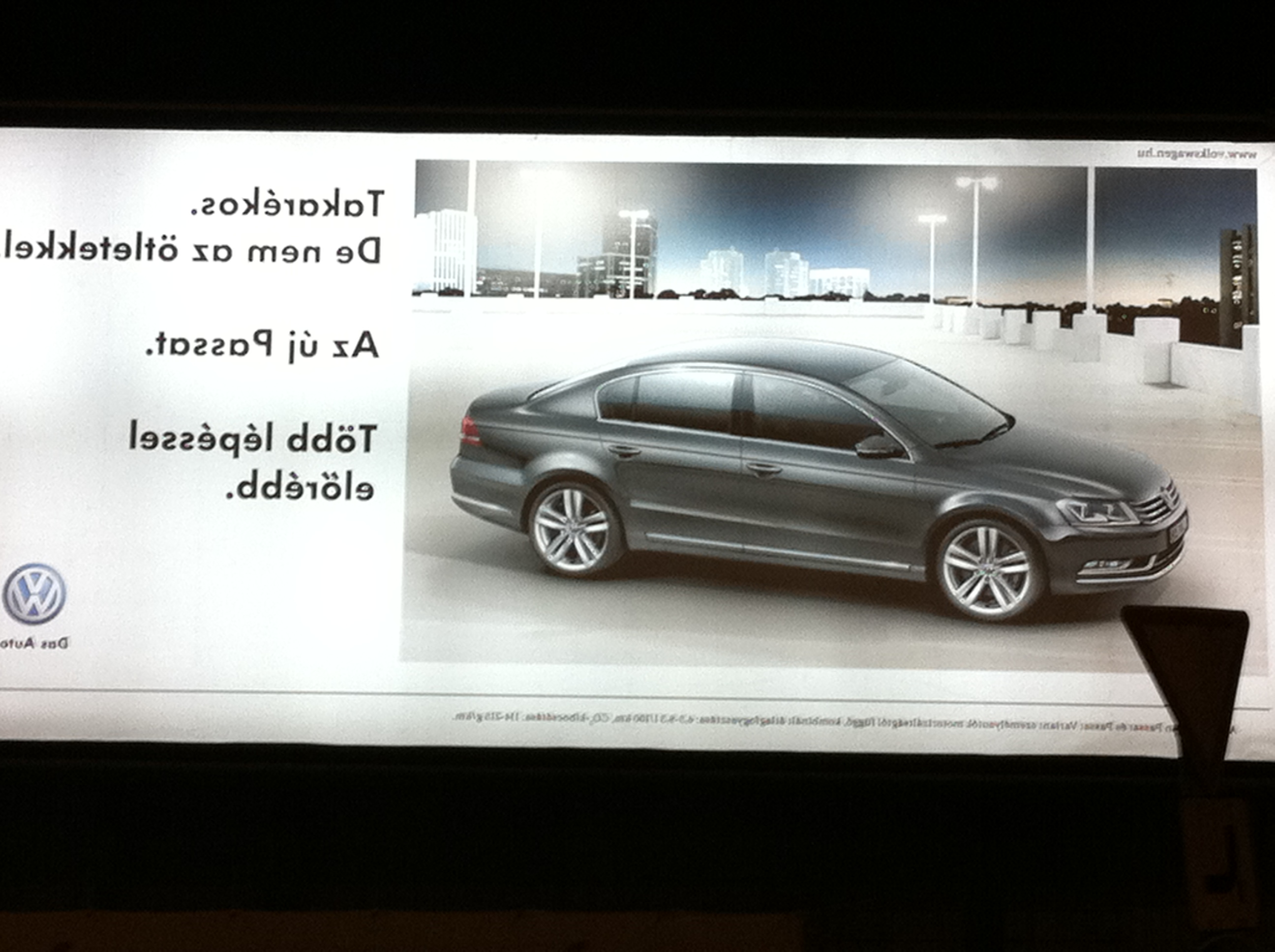Tegnapelőtt este egy feltűnő kreatívba botlottam, ám attól félek, nem volt szándékos. Az új Passat hirdetését valószínűleg véletlen tették ki fordítva és nem kreatív feladatokat akartak adni az arra járóknak (gyanúmat csak erősíti, hogy a plakátot mára eltávolították, üres a keret).