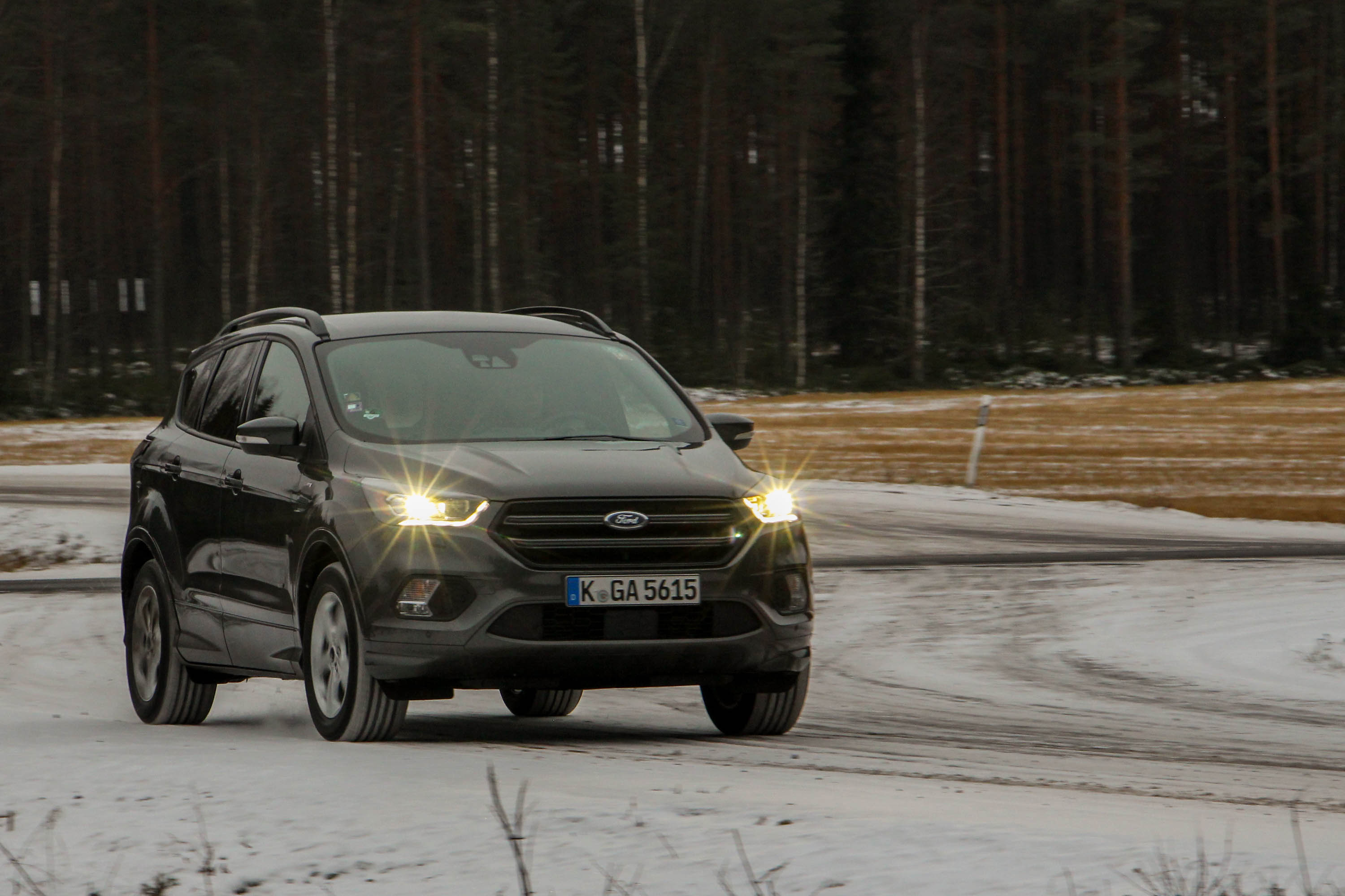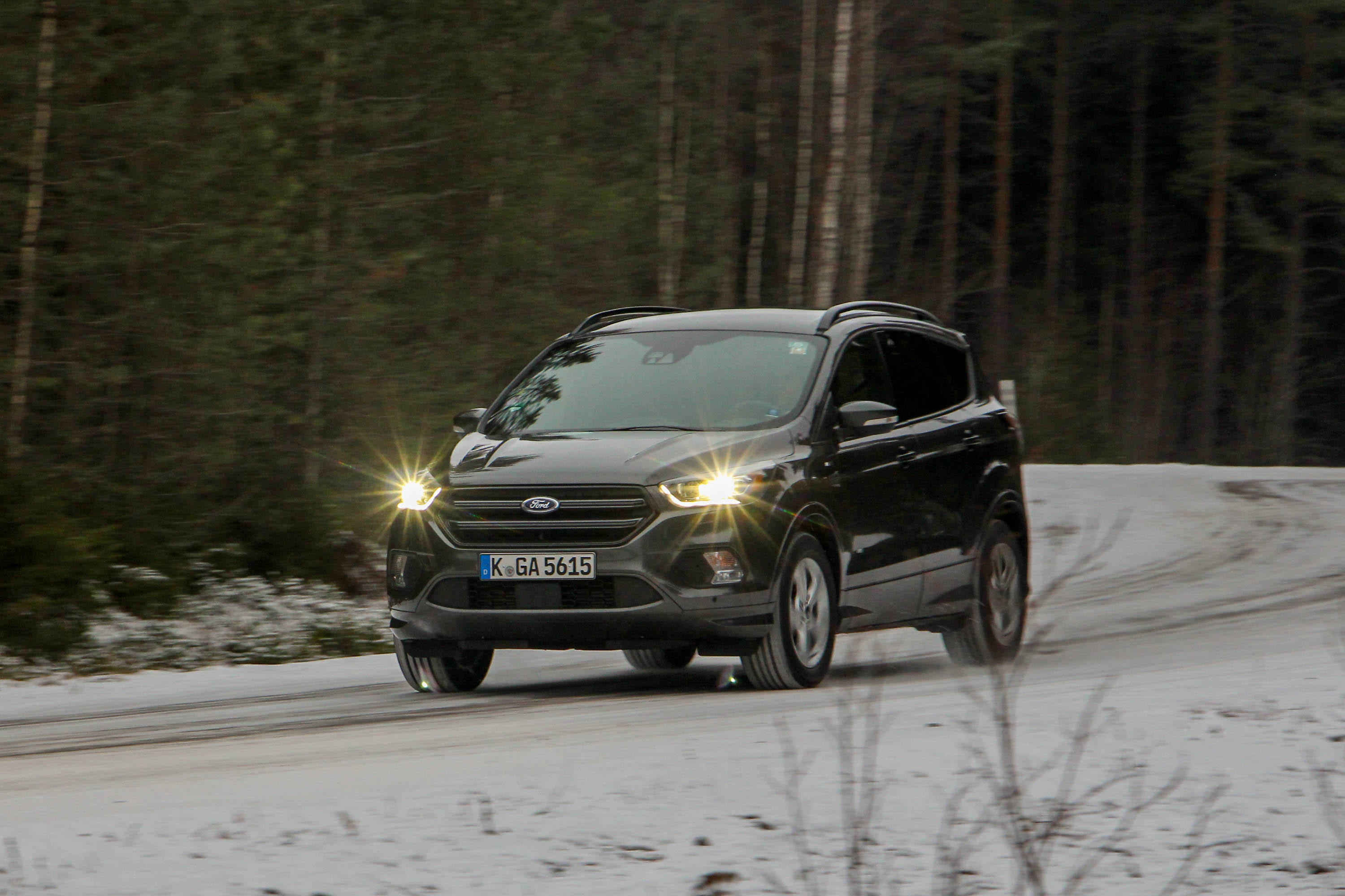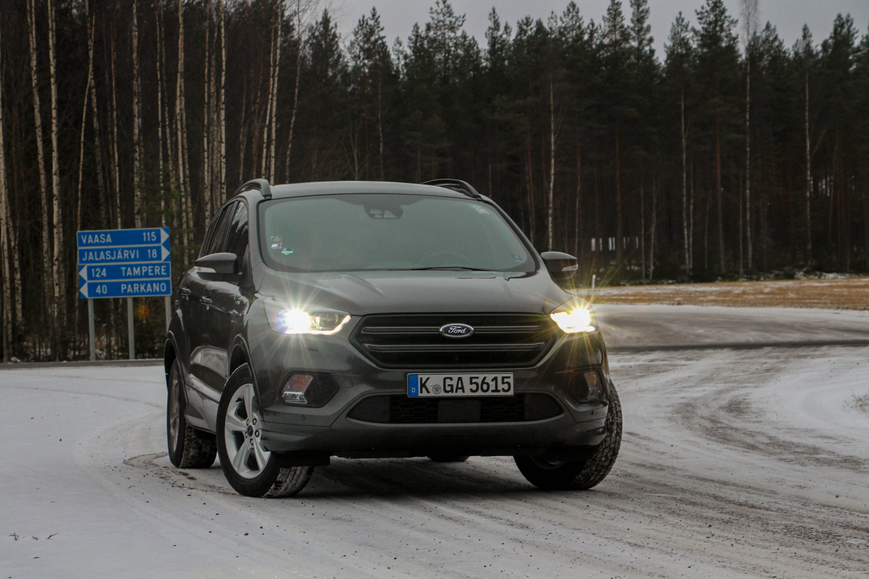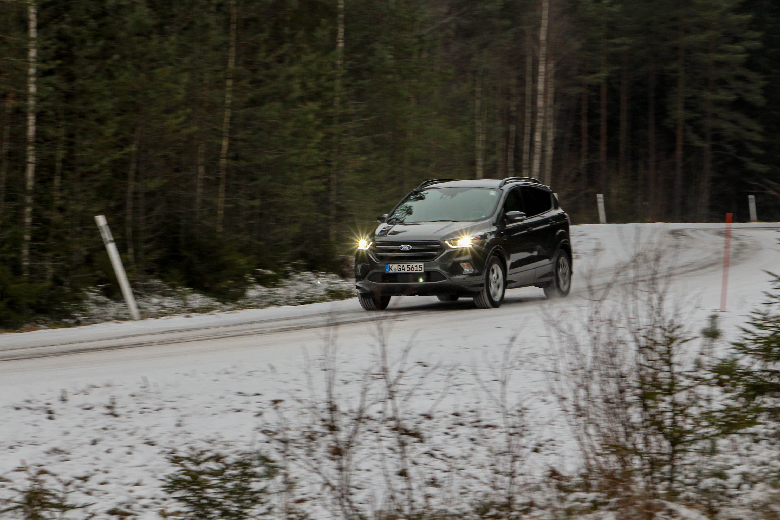 Ami a Kuga frissítését illeti: szemből teljesen új, az európai piacon idén (átdolgozottan) megjelent Edge-re hajaz, így a Kuga az egyetlen európai Ford, amit elkerült az Aston Martin-féle harcsaszáj. Nem csupán a korábbitól eltérők a lámpák, a lökhárítók és a hűtőmaszk, hanem ezek rendeléskor is variálhatók. A Kugából ugyanis most már prémiumos Vignale és sportos ST-Line is létezik. A Vignale teljesen különálló modell, az almárka egyéb vevőcsalogató extráival, fokozott zajszigeteléssel, Windsor bőrkárpitozással és csakis legalább 180 lóerős motorokkal. A sárvédőfelirata mellett fekete lamellás hűtőmaszkjáról felismerhető ST-Line egyel szerényebb, ott 150, a többi Kugánál 120 lóerős az alapmodell. A fényszóró lehet Bi-Xenon és automata reflektoros, valamint egyben kanyarkövető is. A mostanság napsütést nemigen, hosszú sötét éjszakát annál inkább adó Finnországban bőséggel volt lehetőségünk próbálni, jó a fényereje.