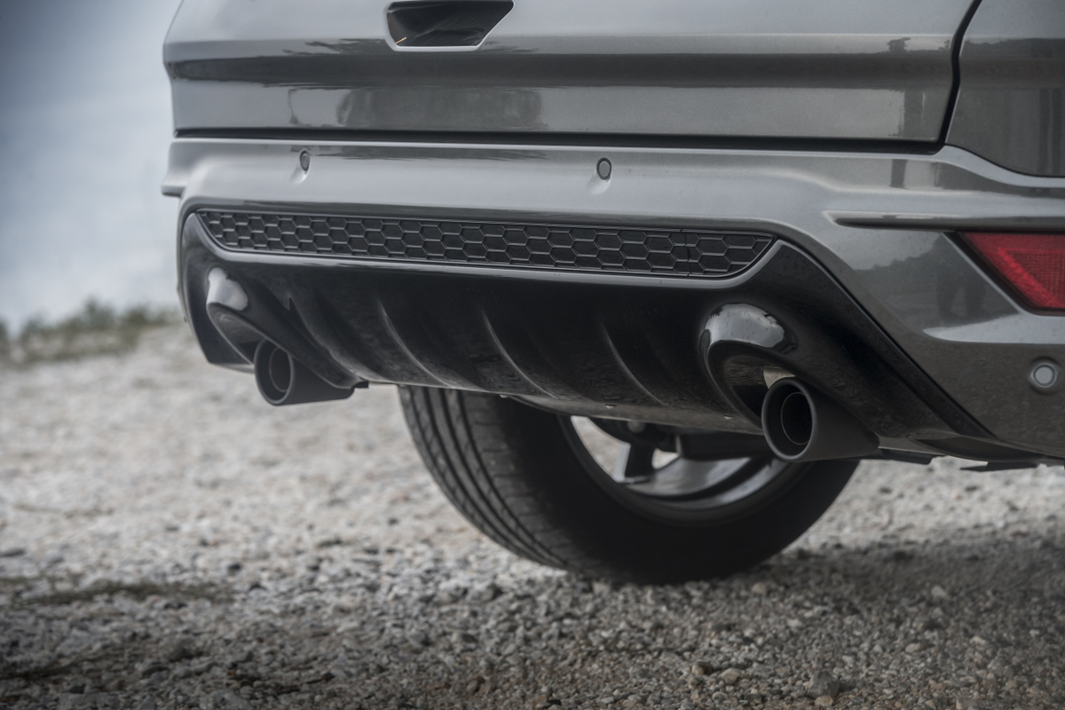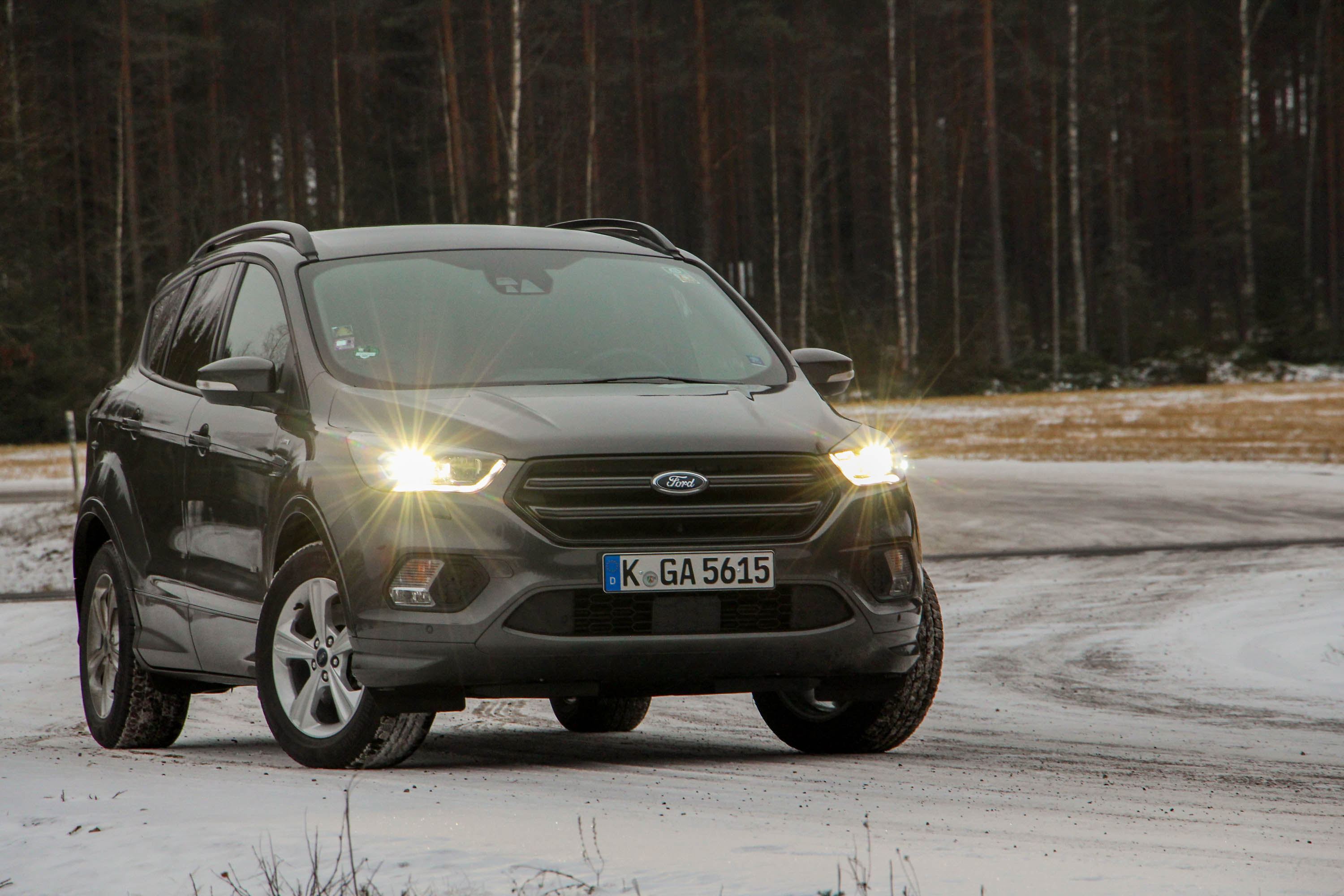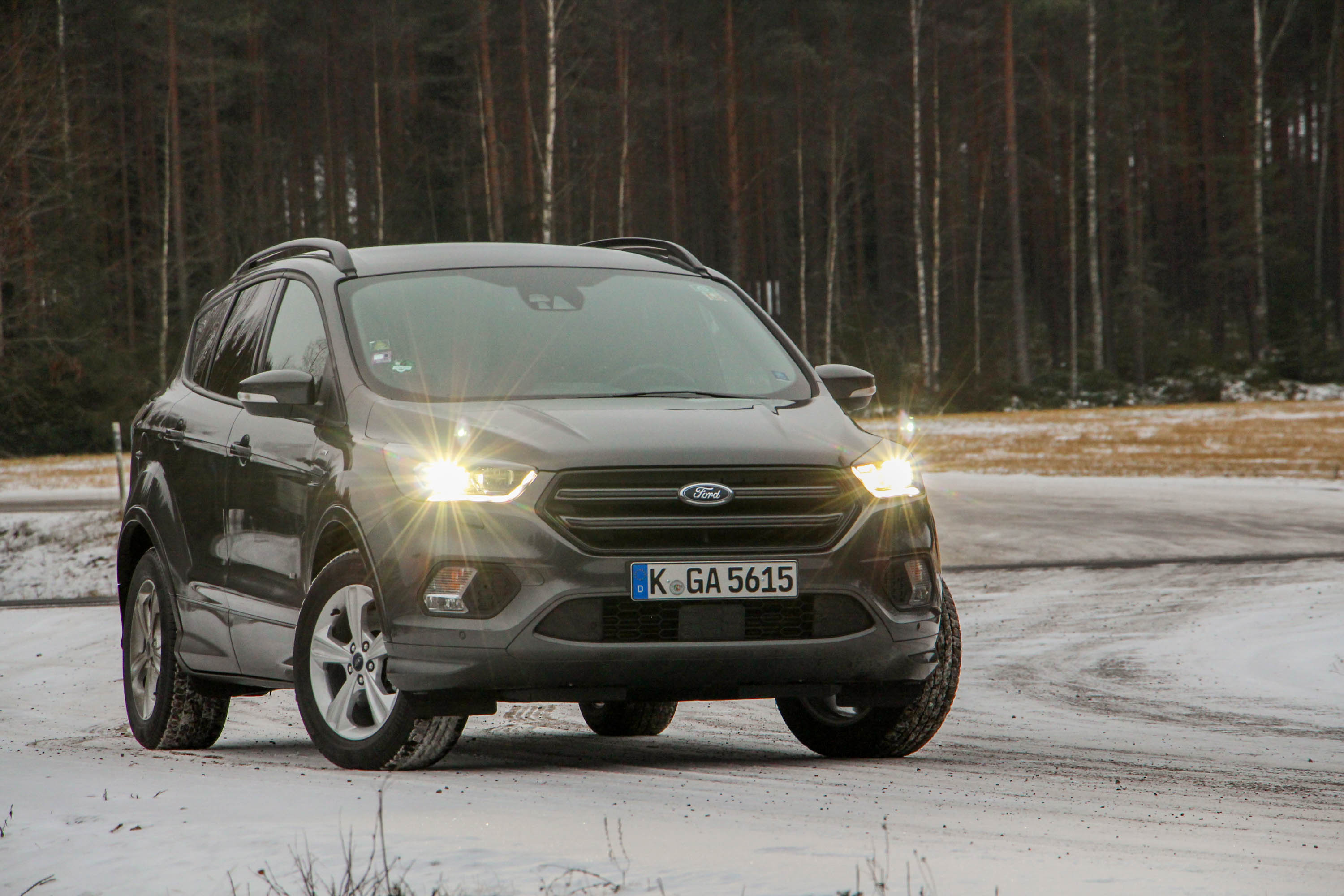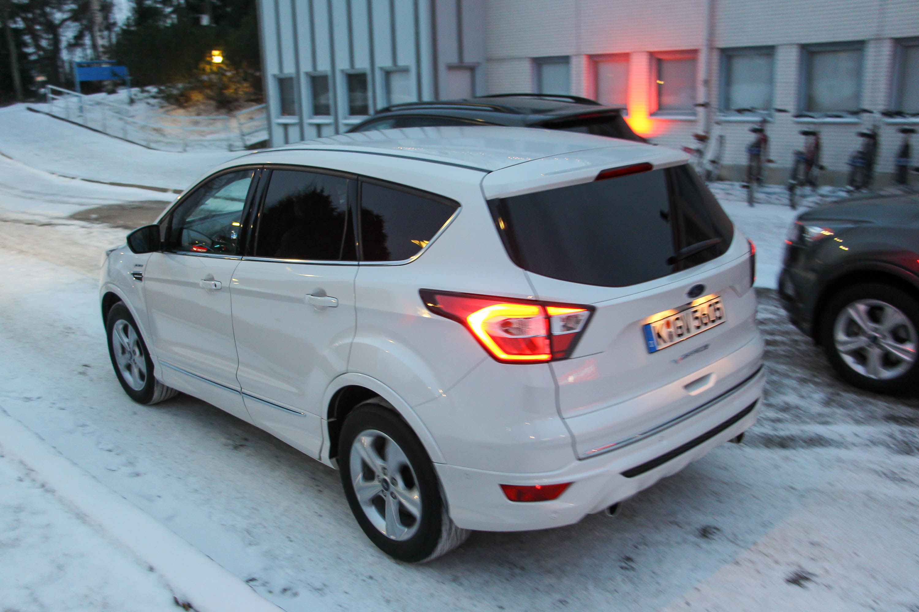 Ami a Kuga frissítését illeti: szemből teljesen új, az európai piacon idén (átdolgozottan) megjelent Edge-re hajaz, így a Kuga az egyetlen európai Ford, amit elkerült az Aston Martin-féle harcsaszáj. Nem csupán a korábbitól eltérők a lámpák, a lökhárítók és a hűtőmaszk, hanem ezek rendeléskor is variálhatók. A Kugából ugyanis most már prémiumos Vignale és sportos ST-Line is létezik. A Vignale teljesen különálló modell, az almárka egyéb vevőcsalogató extráival, fokozott zajszigeteléssel, Windsor bőrkárpitozással és csakis legalább 180 lóerős motorokkal. A sárvédőfelirata mellett fekete lamellás hűtőmaszkjáról felismerhető ST-Line egyel szerényebb, ott 150, a többi Kugánál 120 lóerős az alapmodell. A fényszóró lehet Bi-Xenon és automata reflektoros, valamint egyben kanyarkövető is. A mostanság napsütést nemigen, hosszú sötét éjszakát annál inkább adó Finnországban bőséggel volt lehetőségünk próbálni, jó a fényereje.