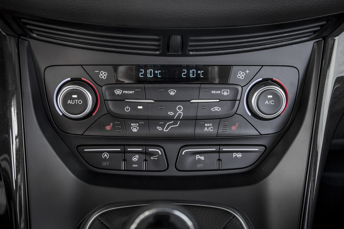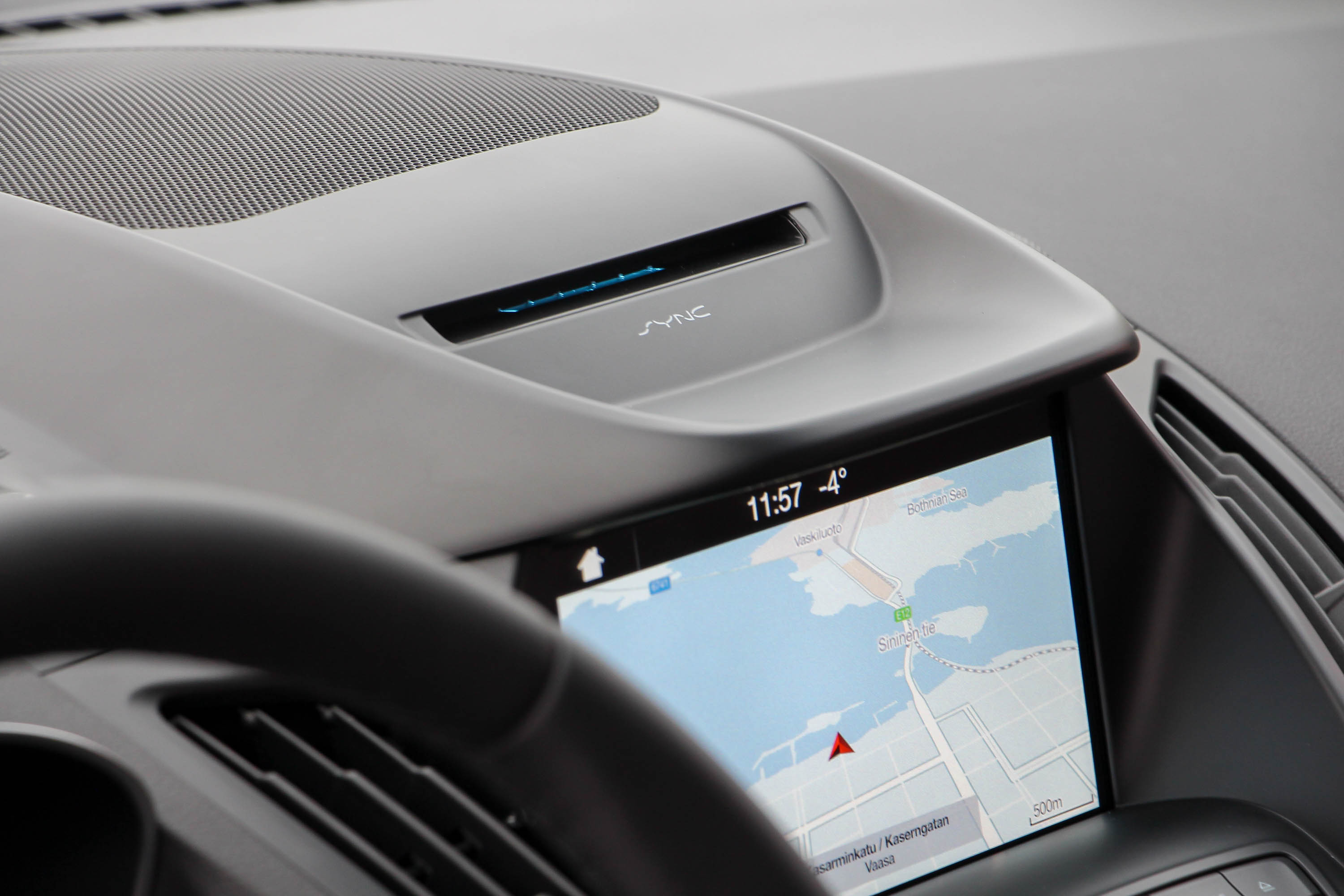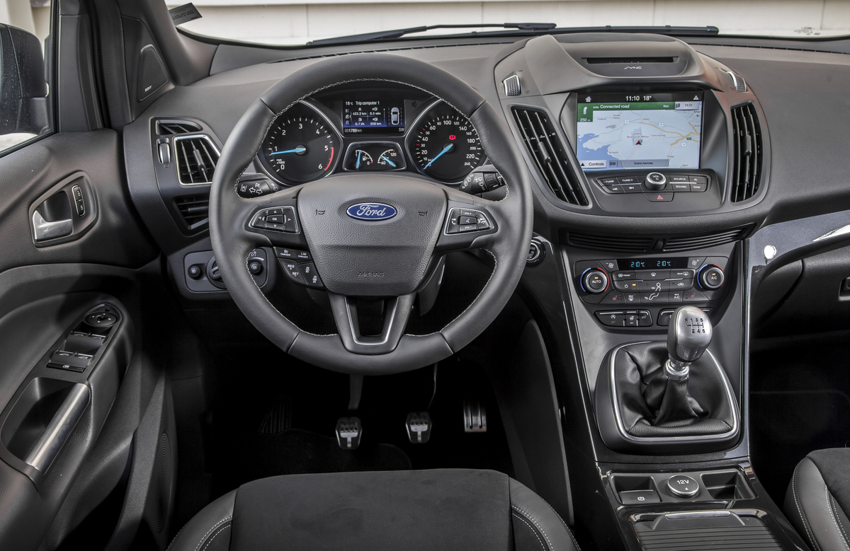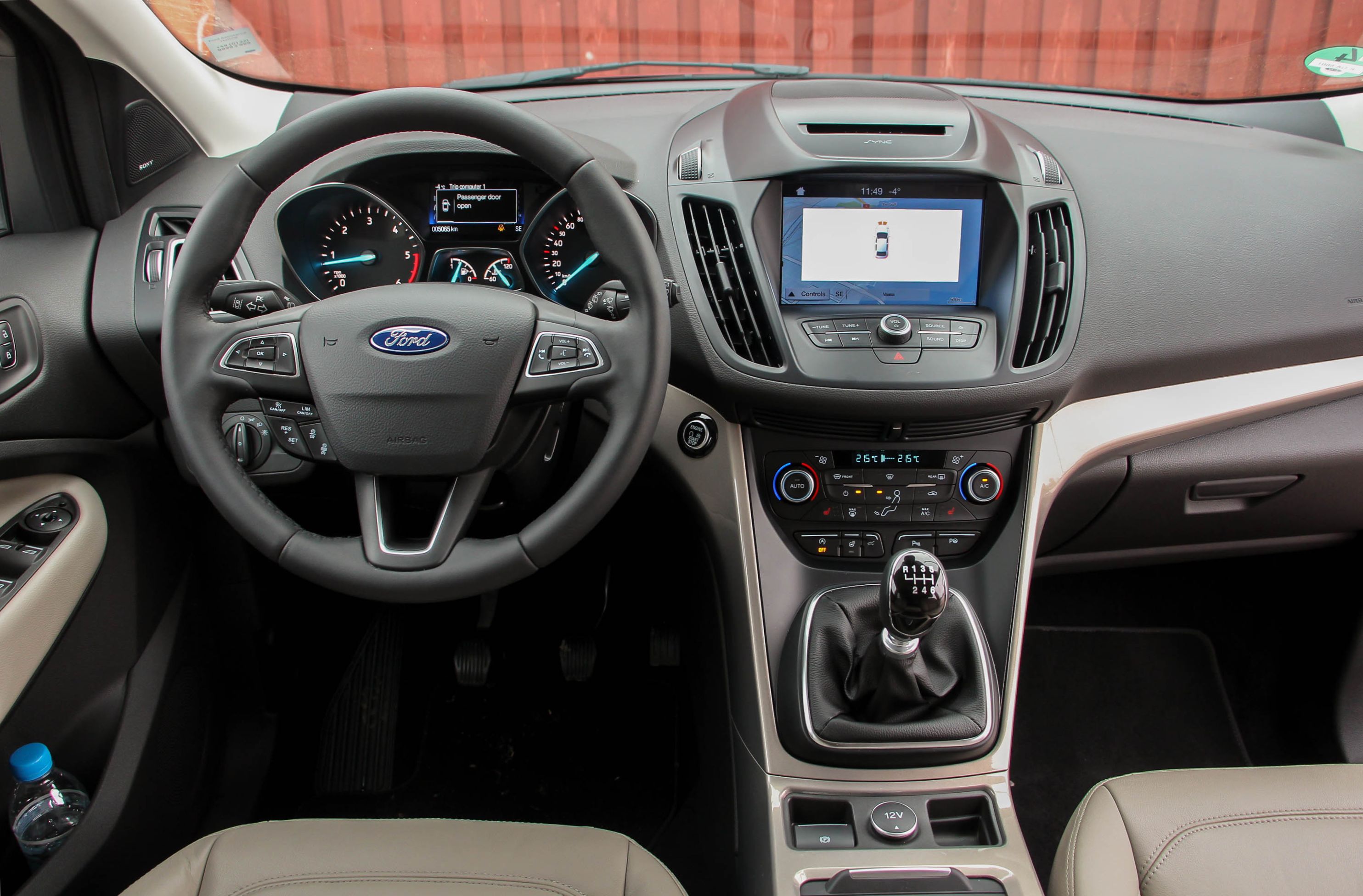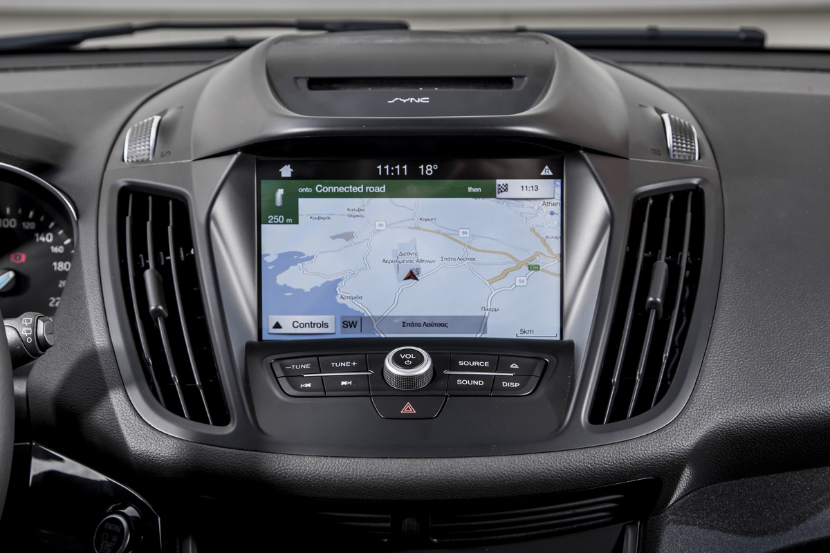 A Kuga frissítésének legfontosabb újítása a középkonzol megújulása, a hidegben elképesztően hasznos opciós kormánykerékfűtés, valamint a 8 colos érintőképernyőn és a néhány dedikált gombon túl hangutasításokkal is vezérelhető SYNC 3 infotainment-rendszer. Ez elődjével szemben már nem Microsoft alapú rendszer, állítólag tízszer gyorsabb, mint a korábbi. Tény, hogy nem lassú, de gyorsításának mértéke komoly kritika az előd SYNC 2 számára. Android Auto és Apple CarPlay támogatás is jár a már az alapverzióban is megtalálható 6 hangszórós, természetesen Bluetooth kapcsolatot és kormányról vezérelhetőséget, valamint CD-olvasót is adó rendszerhez. Nem túl komoly (115 ezer forintért) már 9 hangszórót és tolatókamerás navigációt is kapunk, 25 ezer forintért mélynyomóval.