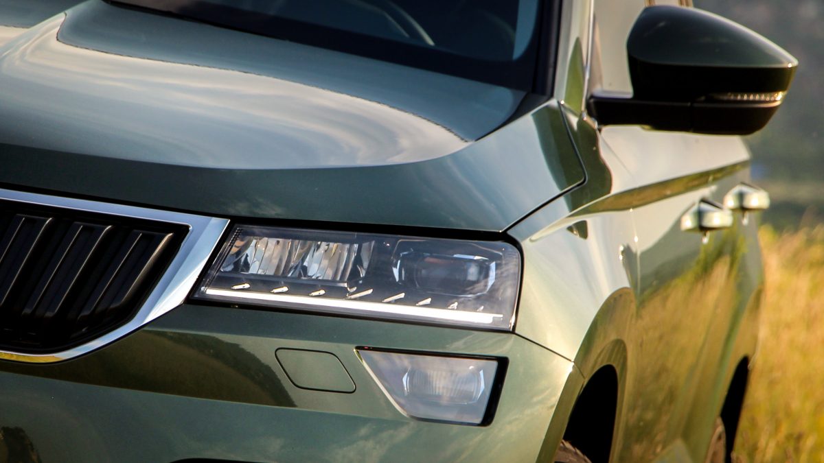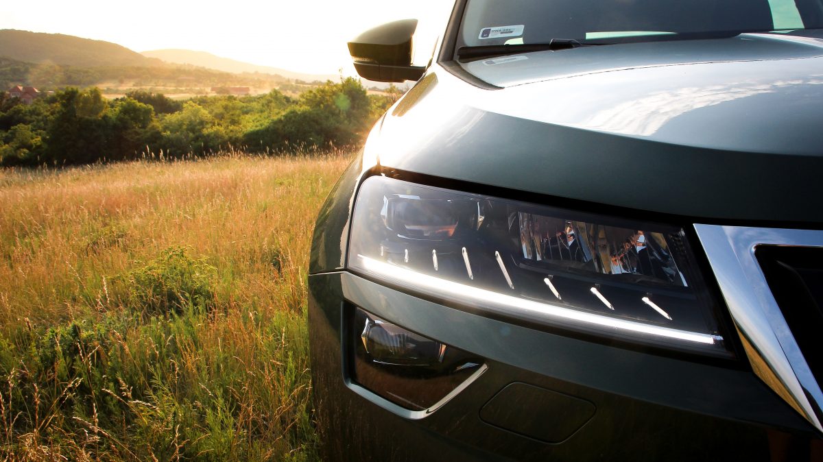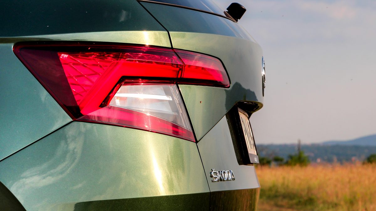 Ahogy az utastér, úgy a külső dizájn sem mutat különbséget a benzines modellhez képest. Azonban mindenképp érdemes megemlíteni, az Emerald zöld metál fényezést. Összesen 14 szín választható a márka konfigurátorában, de bátran ki merem jelenteni, hogy ennél jobban talán egyik sem illik a Karoqhoz. Bár még nem láttam mindegyik színnel élőben, ám a naplementékben elvarázsoló módon csillan meg a zöld karosszérián a fény. Persze ennek ára van, ugyanis 152 400 forintért választható ez a szín.