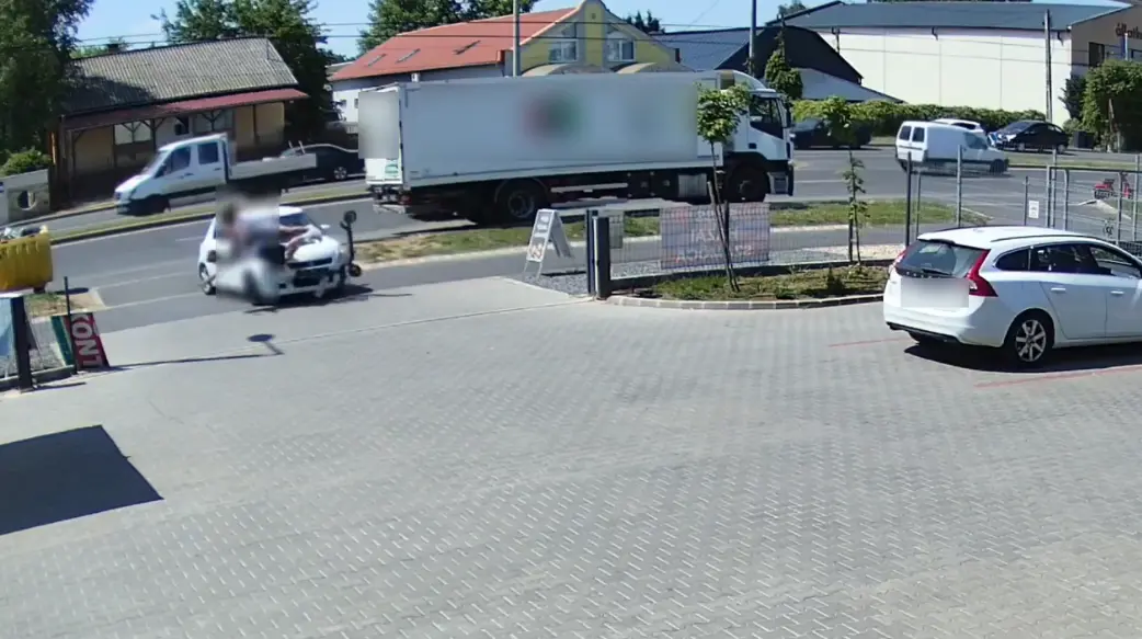 Egy másik esetnél jól kivehetően ketten állnak a rolleren (pedig alapvetően egy személyre tervezik, sőt a rendőrség is többször kiemelte, balesetveszélyes utast szállítani rajta). A felvételen szereplő autó sofőrje későn észleli a viszonylag nagy sebességgel érkező rollerest, így ebben az esetben is megtörtént a baj.