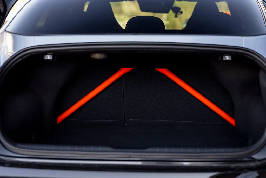 Kezdem megint hátulról, mert amint kinyílik az egyébként 401 literes csomagtér ajtaja, azonnal megpillantjuk a vörösre festett merevítő csöveket. Nem klasszikus bukócsövek, de mégis tovább növelik a versenyautós hatást, és ne mellesleg tényleg javítanak a karosszéria merevségén, ami nagyon fontos ahhoz, hogy az autó a versenypályán is magabiztosan vezethető legyen. Ugyanebben segítenek a kagylósított sportülések, amik a hétköznapi közlekedés során sem kényelemtlenek, valamint a kiváló fogású kormánykerék, a látványos kiegészítő gombokkal, amelyek használatával beállítható mit szeretnénk épp az autótól. Maximális teljesítményleadást? Igazi váltás érzetet? Motorhangot? Minden van, ami jobb mókává tehet egy villany-sportautót.