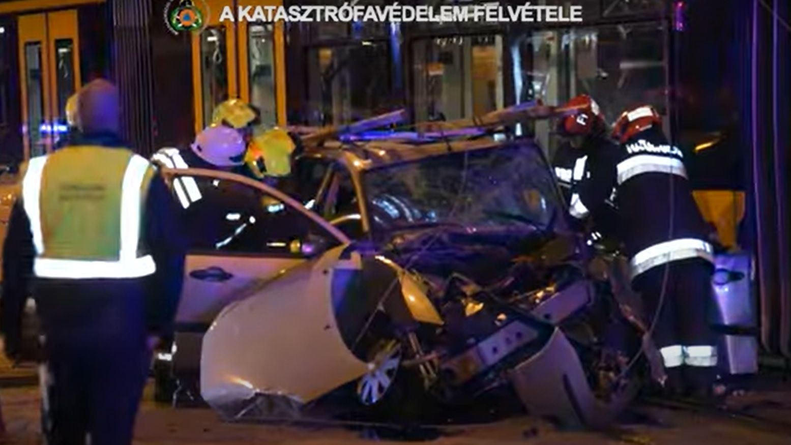 Szerencsére a villamoson nem sérült meg senki, de az autóba beszorult egy személy (A kép a Katasztrófavédelem videójából származik)