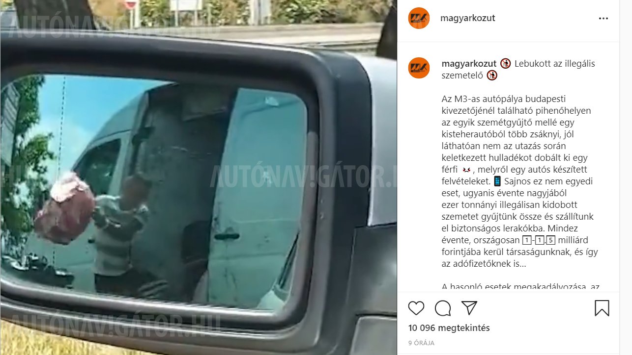 A Magyar Közút legújabb instagram videójában mégis pontosan ez történik: egy civil autós a visszapillantó tükrében videózza, ahogy egy férfi zsákszámra pakolja ki az illegális szemetet egy autópályaparkolóban. Hogy ez miért nem a megfelelő viselkedés, az több módon is kifejezhető. A legegyszerűbben talán úgy, hogy amíg a Közútkezelő nem viszi a te kukád mellé zsákszámra az autópályákon összegyűlt, utazás közben keletkezett szemetet, addig te sem viheted a pálya pihenőjéhez a sajátodat. Ha ez a logika nem érintene meg, nyomós érv lehet még, hogy a januárban megváltozott jogszabályok alapján akár hároméves börtönbüntetést is kaphatnak az illegális szemetelők.