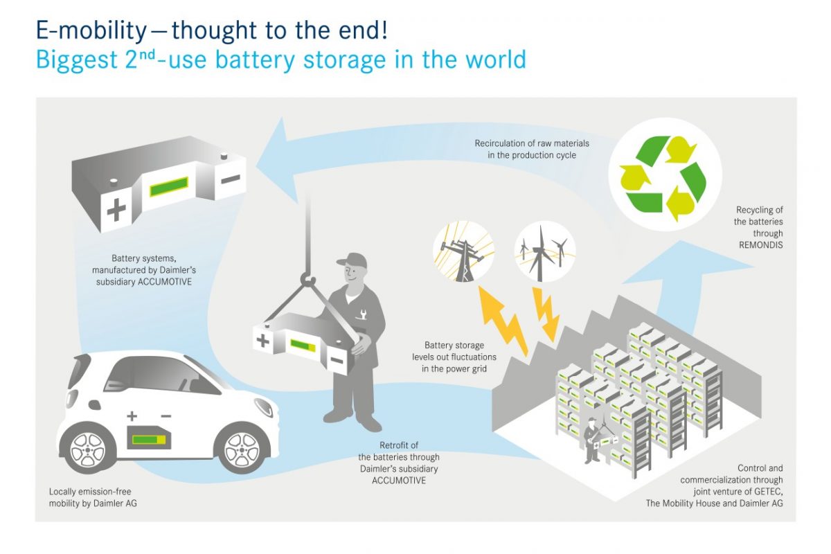 A Daimler, a The Mobility House, a Getec és a Remondis SE együttműködésével akár újabb telepek is megvalósulhatnak a jövőben a kiszuperált akkumulátorok megvalósítására. Ezekkel kiegyenlíthetők az olyan ingadozások a hálózatban, amelyek abból adódnak, hogy a megújuló energiaforrásokból - például szélerőművekből és napenergia-telepekről - származó energia-utánpótlás nem egyenletes, hanem napszak- és időjárásfüggő. Ráadásul így további körülbelül 10 évig hasznát vehetjük az autókban már nem hatékony akkumulátoroknak, mielőtt szétszedve részben ismét új akkumulátorok gyártására forgathatók majd vissza. Ugyanezt a koncepciót korábban már a Nissan is megálmodta, ám a Leafek akkumulátorai még