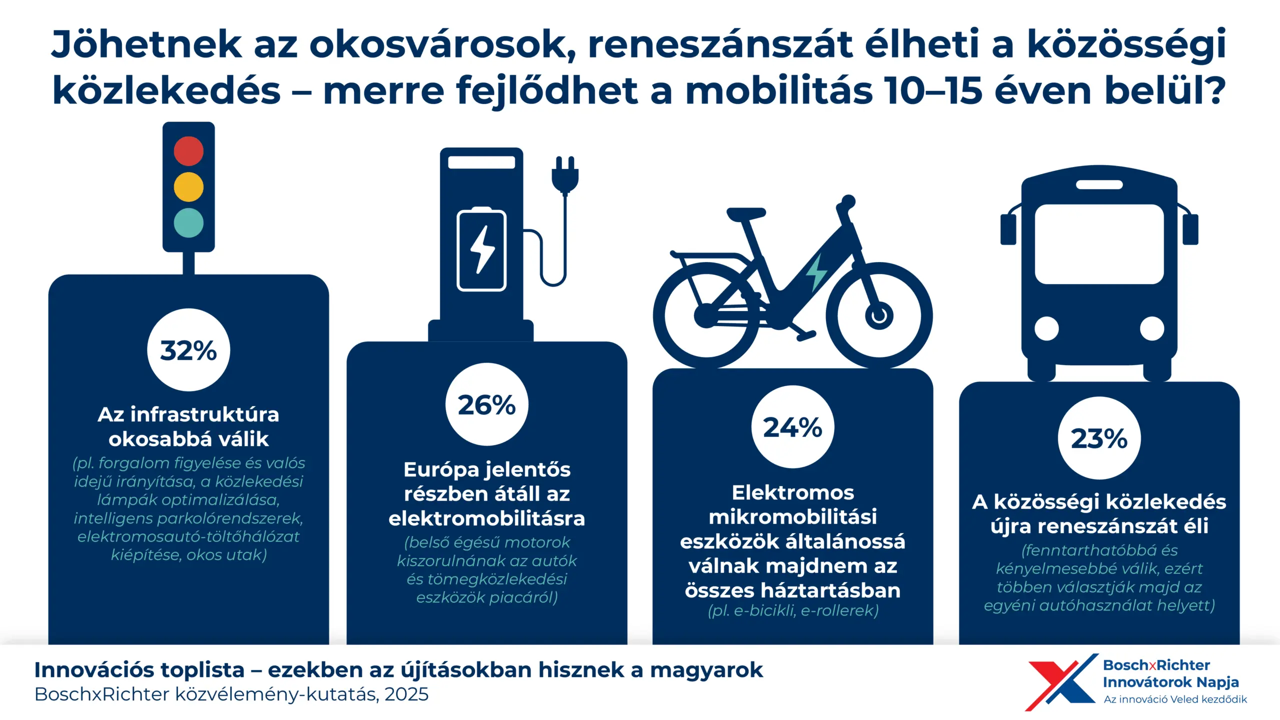 Legyen szó közlekedésről, fenntarthatóságról, egészségügyről vagy a városi élet kihívásairól, sokak szerint az innovatív technológiák hozhatják el a kedvező változást. Magyarországon valamivel többen érzik közel magukhoz a technológiai újításokat (51%), mint ahányan távolságtartással fordulnak ezek felé (48%). Az innovációk befogadása életkoronként, iskolázottság, sőt jövedelmi helyzet szerint is nagyon eltérő. A 16–29 évesek között például több mint másfélszer akkora (64%) az új technológiákra fogékonyak aránya, mint a 60 év felettiek körében (39%). Legalábbis ez derül ki a Richter Gedeon Nyrt. és a magyarországi Bosch csoport megbízásából az Europion kutatóintézet által végzett, 1072 fős, életkor, nem, iskolai végzettség, a lakóhely településtípusa és régiója szerint is reprezentatív közvéleménykutatásából. A fenntarthatóság és a klímatudatos városok jövője aligha képzelhető el a közlekedés, a személy- és áruszállítás rendszerének újragondolása nélkül. A kutatási eredmények alapján – az iparág jelenlegi bizonytalanságai ellenére is – egyértelműen az autógyártást tekintik a magyarok a leginnovatívabb (48%) mobilitási ágazatnak, egyúttal a leghasznosabbnak (40%) is ezt tartják. Emellett sokan tekintik előremutatónak a városi mikromobilitás (32%) és a közösségi közlekedés (31%) fejlesztését, de a logisztika (32%) és a közlekedési infrastruktúra (30%) területén is hasznosnak és szükségesnek tartják az innovációt. „A kutatás adatai is megerősítik, hogy a járműipari innovációkra különösen nagy a társadalmi igény. A közlekedéssel kapcsolatos fejlesztések kulcsfontosságúak a jövő szempontjából, legyen szó autógyártásról, közösségi közlekedésről vagy a holnap okosvárosairól.” – fűzte hozzá az eredményekhez Dr. Szászi István, a Bosch csoport vezetője Magyarországon és az Adria régióban. A válaszadók közel harmada szerint 10–15 éven belül az infrastruktúráink okosabbá válhatnak (32%): megvalósulhat a forgalom valós idejű figyelése és automatikus irányítása, a közlekedési lámpák intelligens optimalizálása, az okosutak és a szabad helyeket „látó” városi parkolási rendszerek is. Minden negyedik válaszadó (23–26%) ennél is tovább megy. Szerintük a következő egy-másfél évtizedben Európa jelentős részben átáll az elektromobilitásra, vagyis a belső égésű motorok kiszorulnak az autók és tömegközlekedési eszközök piacáról. Ezzel párhuzamosan az elektromos mikromobilitási eszközök, e-kerékpárok, e-rollerek általánossá válnak majdnem az összes háztartásban. A közösségi közlekedés pedig újra reneszánszát éli majd: fenntarthatóbbá és kényelmesebbé válik, így többen fogják választani az egyéni autóhasználat helyett.
