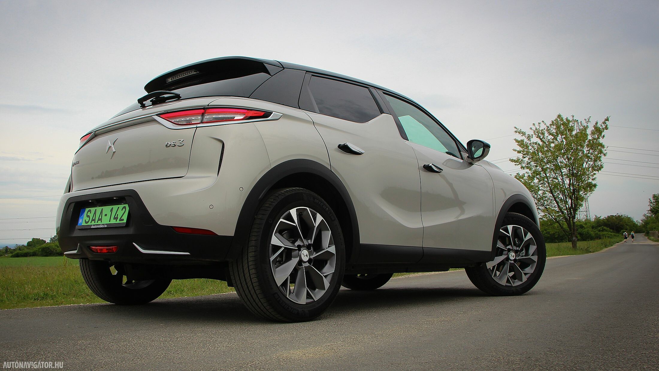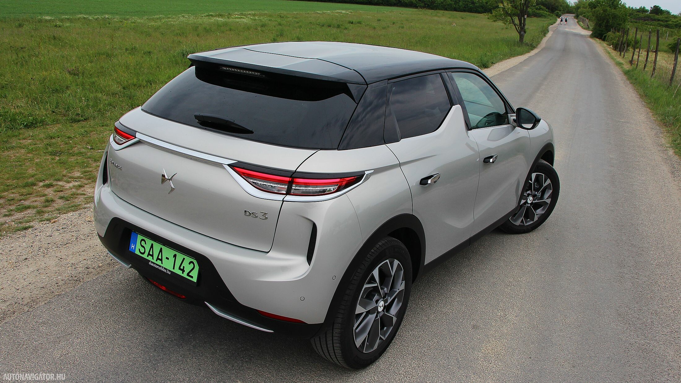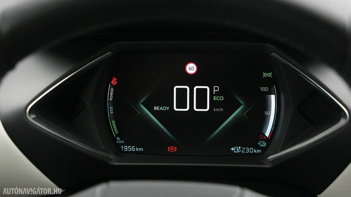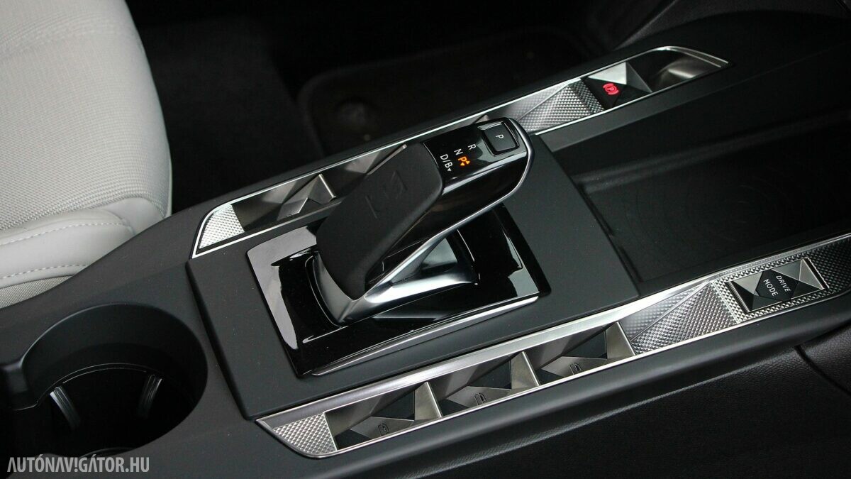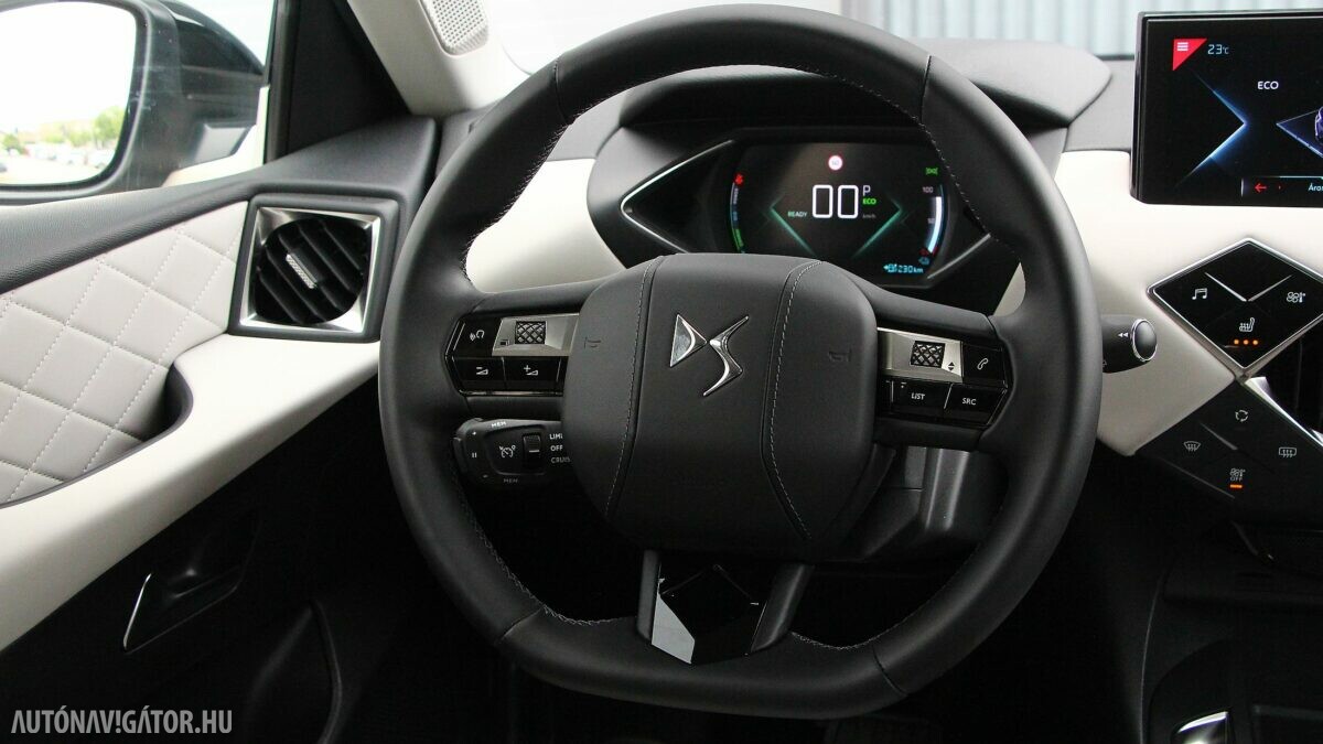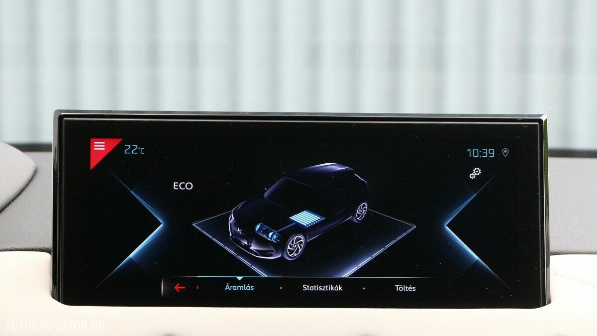 A Crossback ráadásul még egy kicsit terepjáró is akar lenni. A 17 centis hasmagasság elég is a telekjáráshoz. Viszont a futóműben érdekes kettősséget éreztem. Elöl sportosan közvetlen a kormányzás, szépen íven is tartható még nagy sebességnél is a DS 3, viszont a Panhard rudas hátsó hajlamos elpattogni egy-egy nagyobb úthibán, azonnal visszarángatva a „versenyautós fantáziálgatásból”. Ráadásul lágyan ringatózóra hangolták a futóművet, szóval hiába kacsintgat az extra nyomatékkal és a kormányzás rásegítésével is variáló Sport mód, mégiscsak a Normal és az Eco illik a DS 3 karakteréhez. Utóbbit kiválasztva, az automatikus váltó karját pedig B-állásba helyezve az 50 kWh-ás akkuból csak annyi energiát szív az autó, hogy tényleg elérhető vele a 320 kilométeres hatótáv. Városi és egy kis hegyvidéki agglomerációs közlekedéssel hozta a gyári (WLTP) fogyasztási értéket, tehát 14,8 kWh/100 kilométert.