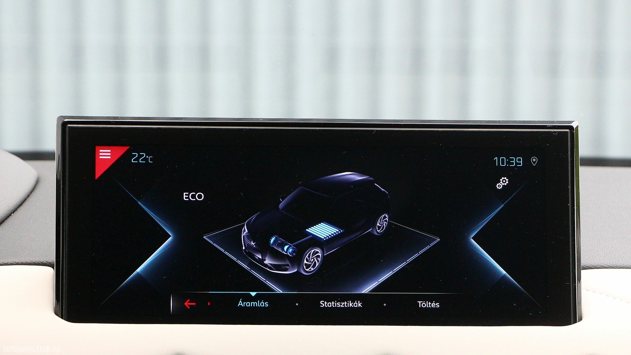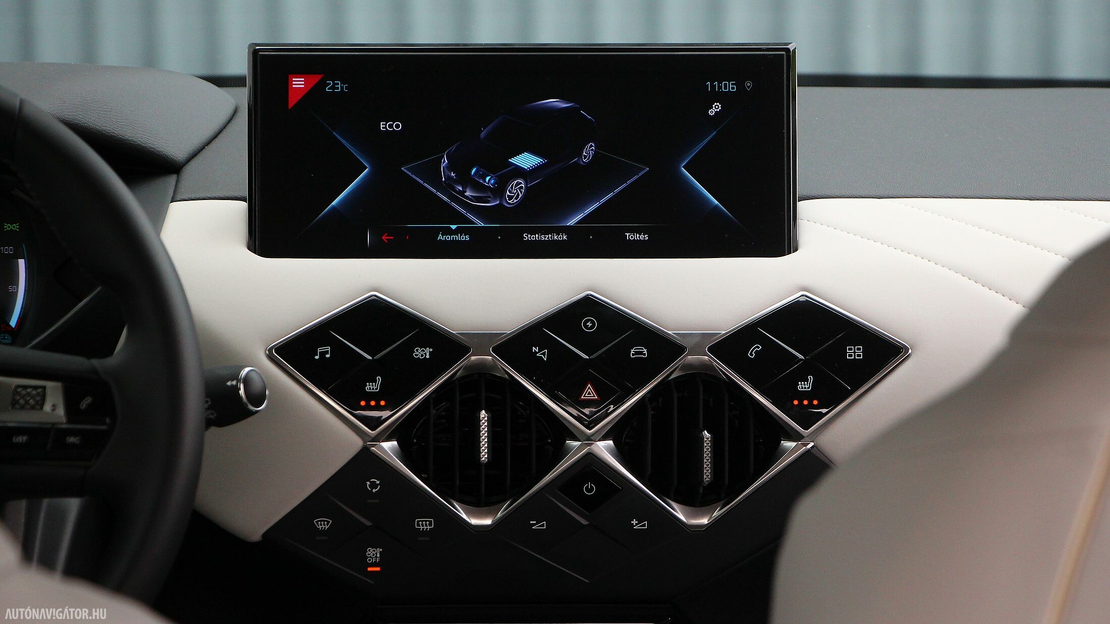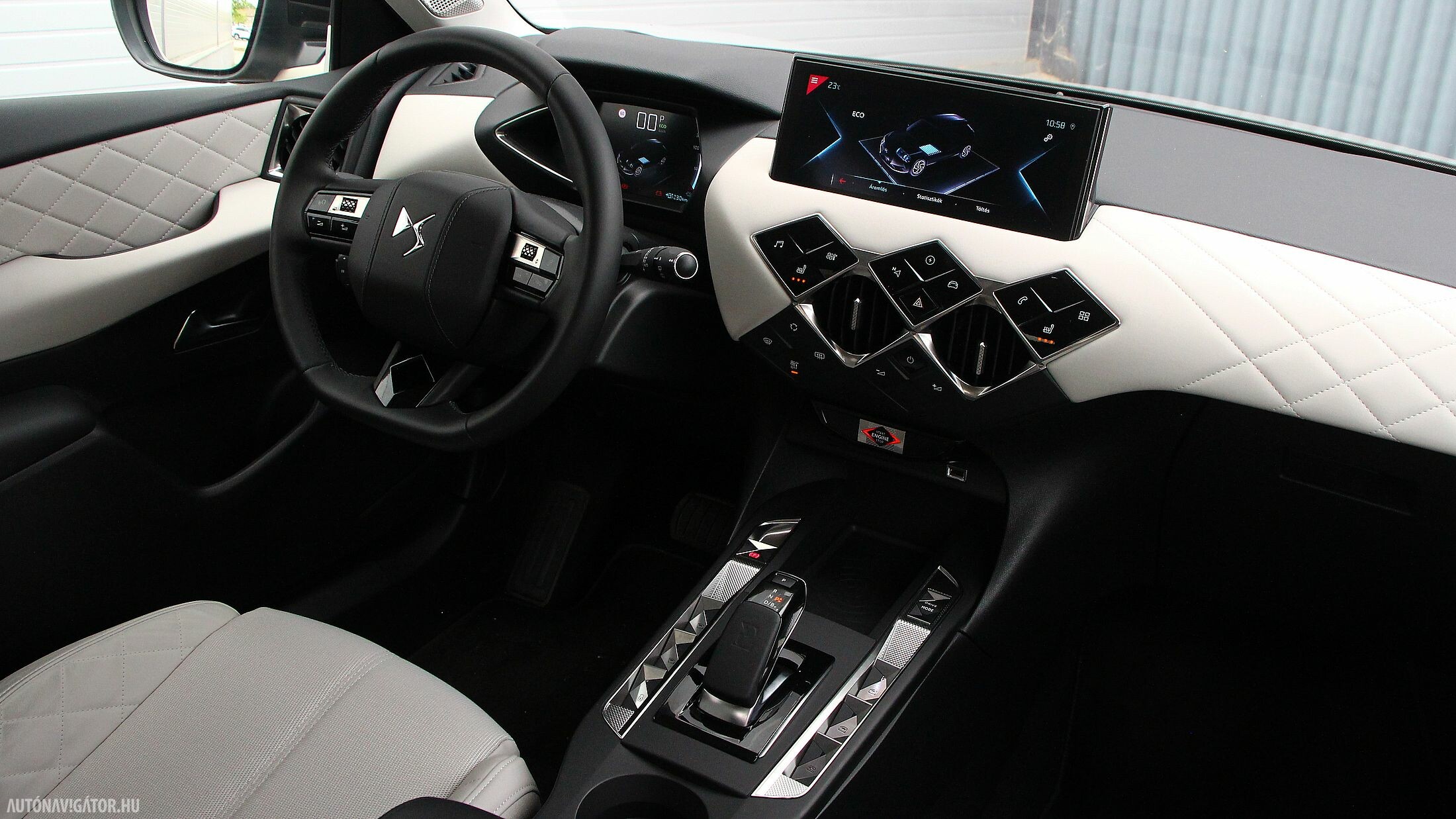 Első pillantásra kaotikusnak tűnhet a műszerfal a formaorgia miatt, ám valójában egyszerű kezelni. A 10,3 colos érintőképernyő alatt csoportosul minden fontos gomb, amiket elég csak megérinteni. Az infotainment-rendszer telefontükrözős, de gyári navit is tartalmaz, a vezető előtti műszeregység pedig digitális, kristálytiszta grafikával. Megszokást igénylő részlet viszont a kardánalagútra helyezett ablakmozgató gomb, vagyis gombok. Kidolgozásuk szemet gyönyörködtető, de néhány útba beletelt, mire megszoktam, hogy ne az ajtóburkolaton keressem őket, vigasztalásul a vezeték nélküli telefontöltésnek is örülhettem.
