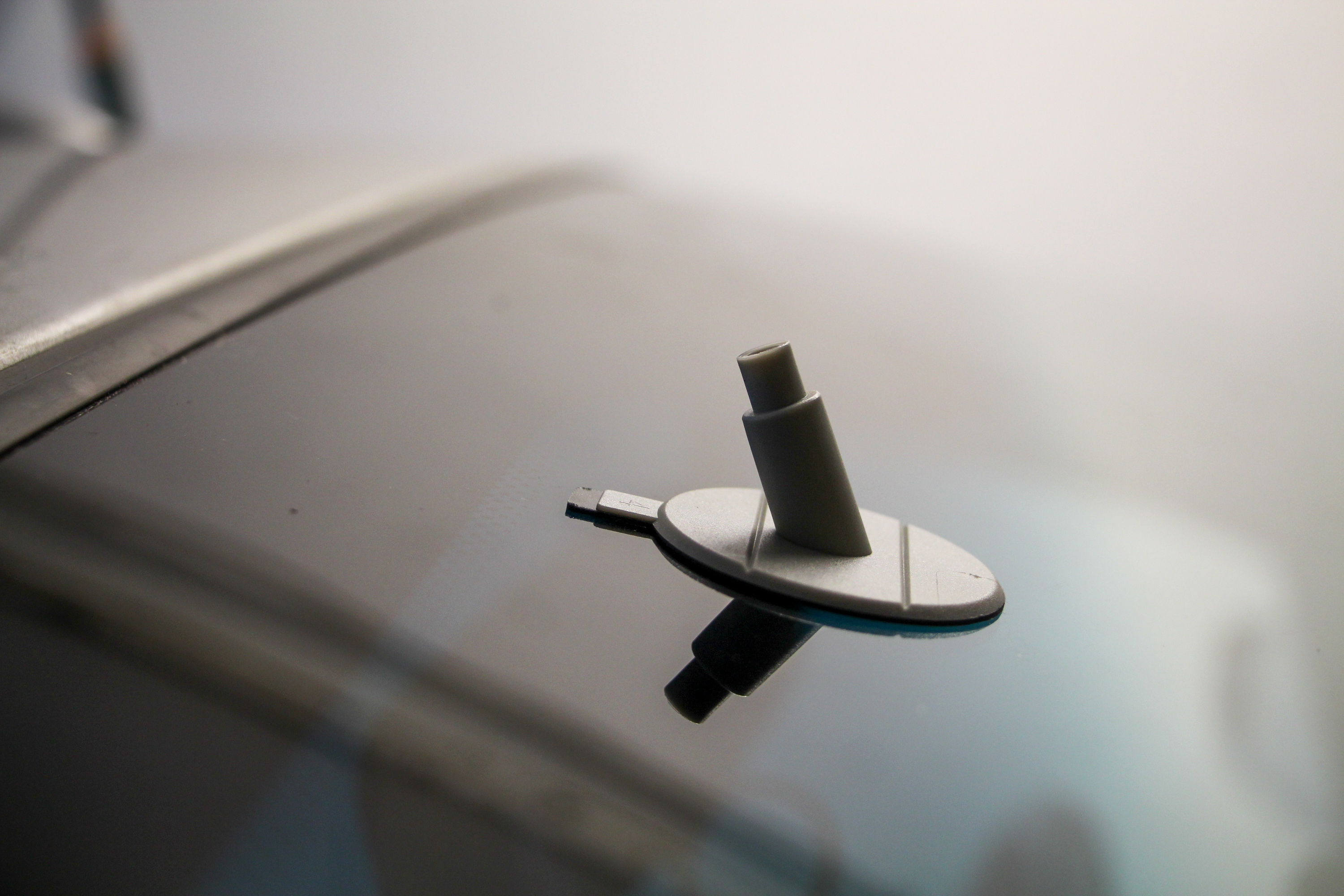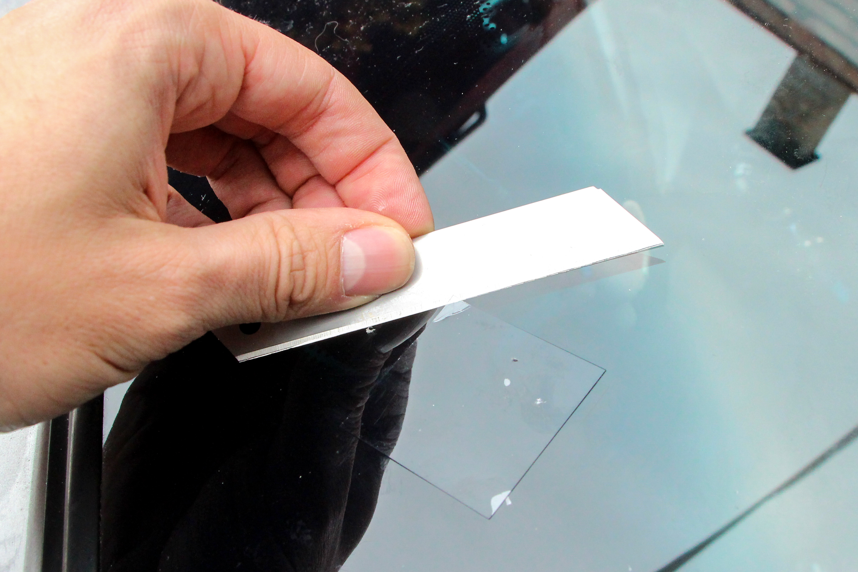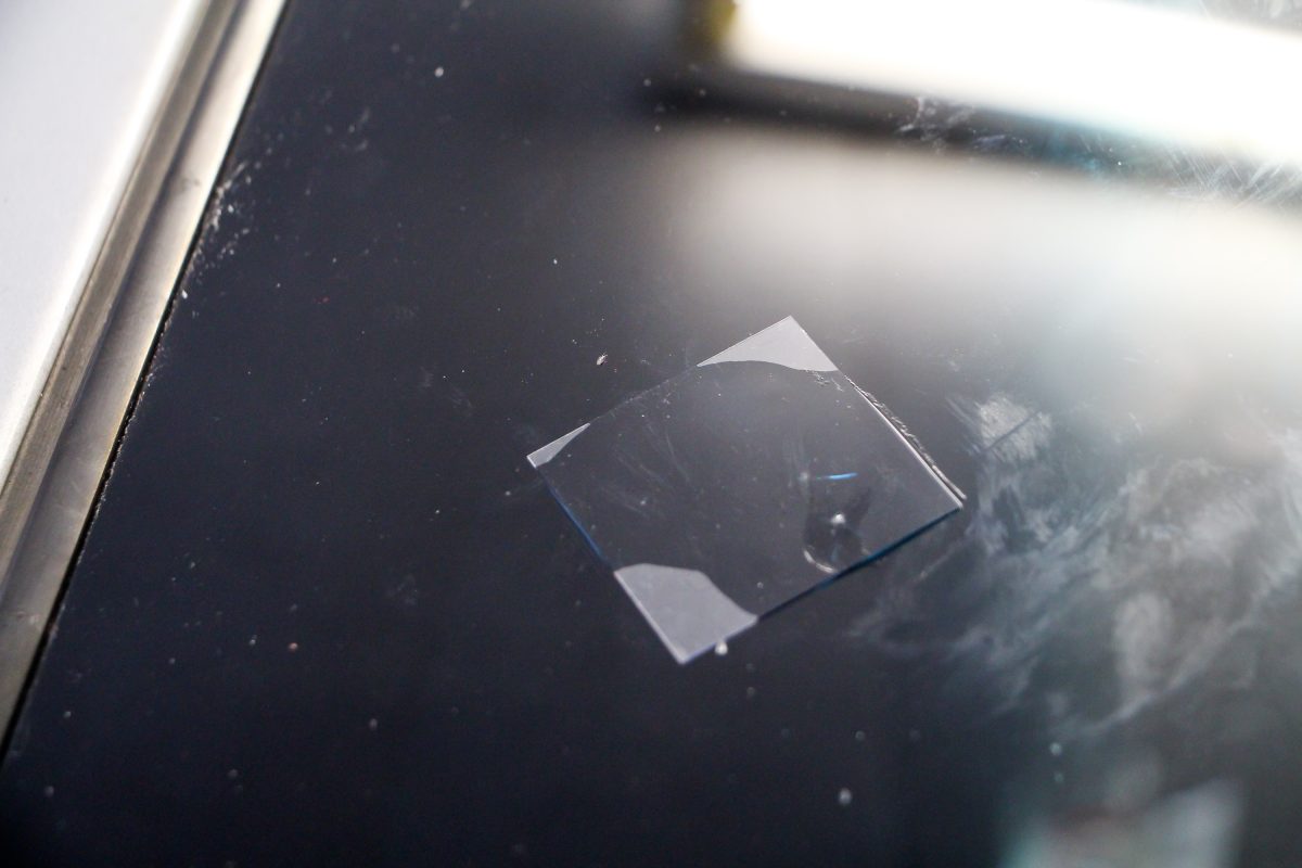 Kellett még maradnia pár csepp ragasztónak a kis tubusban, abból most pár cseppet még tegyünk a sérülésre és gyorsan rakjuk rá azt a kis átlátszó műanyag lapot, ami a csomagban volt. Most vigyük napfényre az autót, ha tiszta az ég, elég fél óra, ha borult, felhős, akkor hagyjuk kint egy órát minimum. Végül tépjük le a műanyag lapot és egy pengével óvatosan kaparjuk le a felesleget a szélvédőn, vigyázzunk, hogy ne karcoljuk meg azt. Ebben az utolsó lépésben simára alakítottuk a felületet, ha maradt is sérülés, mint nálam, akkor sem fog kosz, vagy víz menni bele.