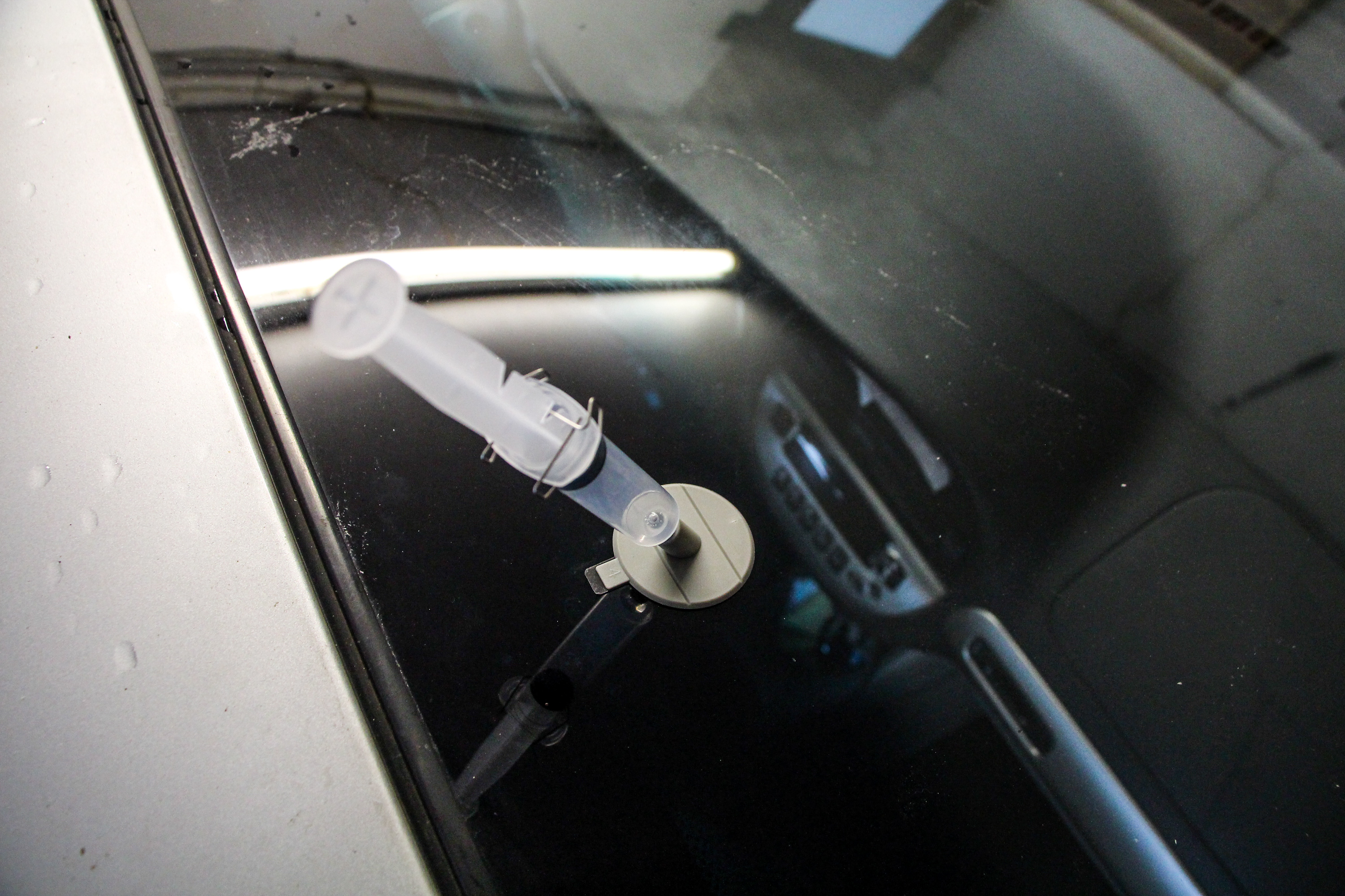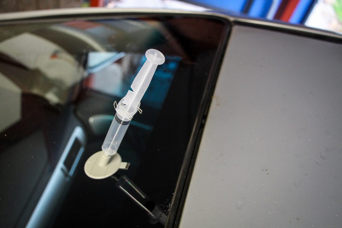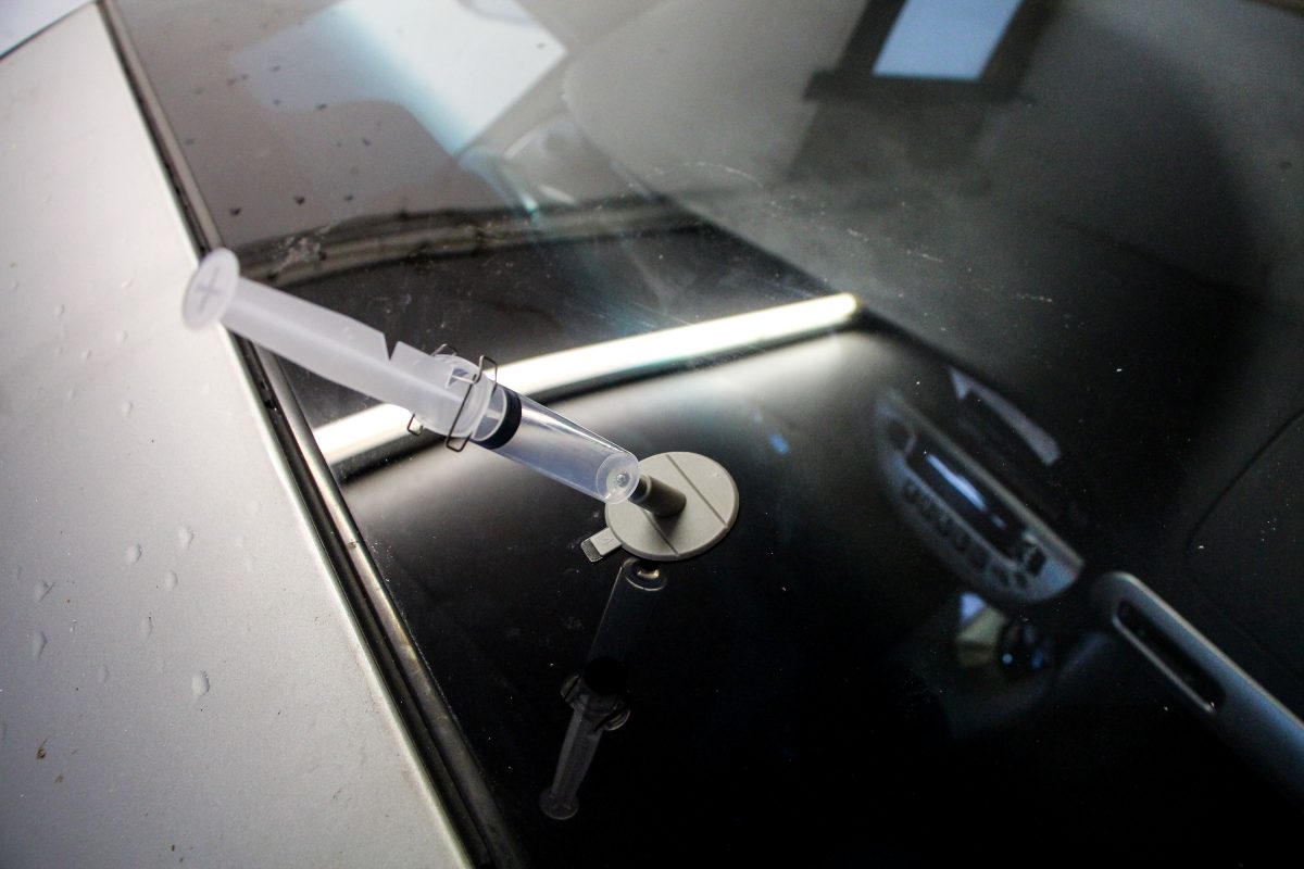 A kis szürke csövet töltsük meg a ragasztóval, állítsuk bele a fecskendőt és húzzuk fel az alsó vágatig. Ezt a fecskendőt egy kis tartószerkezettel egészítették ki, ugyanis ebben a kihúzott állapotban kell maradnia 10 percig, ilyenkor keletkezik vákuum és szívja ki a sérülésből a levegőt, ami helyére befolyik a ragasztó. A következő lépésben vegyük le a fecskendőt, tegyük vissza, majd toljuk be, hogy a fölső vágaton akadjon meg. Így 20 percet kell pihennie, ilyenkor nyomás alatt még több ragasztó jut a sérülésbe. Bentről az egész folyamatot figyelhetjük, de akár egy tükröt is rakhatunk a szélvédő mögé. Nyáron egyszerűen nekiállhatunk ennek az egésznek,