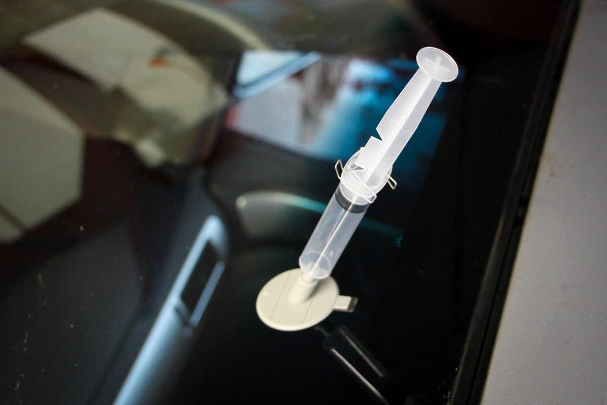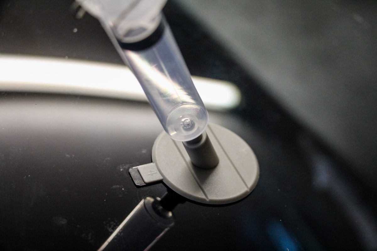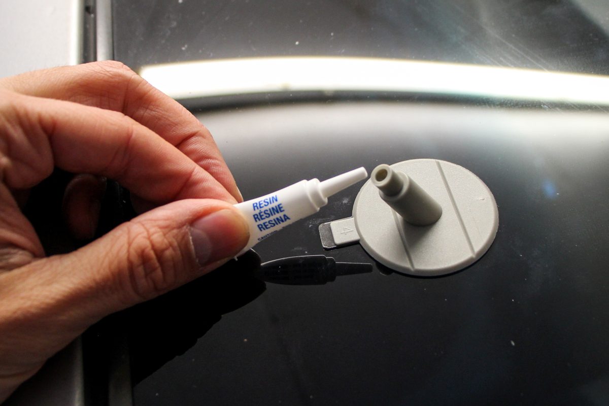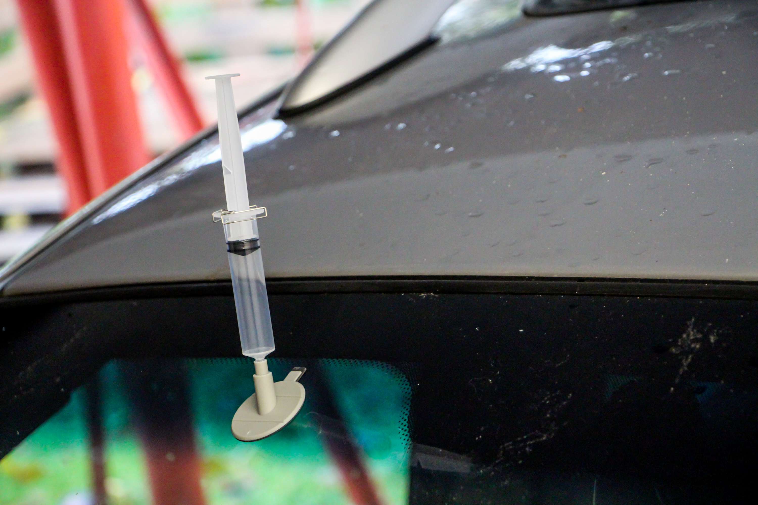 A kis szürke csövet töltsük meg a ragasztóval, állítsuk bele a fecskendőt és húzzuk fel az alsó vágatig. Ezt a fecskendőt egy kis tartószerkezettel egészítették ki, ugyanis ebben a kihúzott állapotban kell maradnia 10 percig, ilyenkor keletkezik vákuum és szívja ki a sérülésből a levegőt, ami helyére befolyik a ragasztó. A következő lépésben vegyük le a fecskendőt, tegyük vissza, majd toljuk be, hogy a fölső vágaton akadjon meg. Így 20 percet kell pihennie, ilyenkor nyomás alatt még több ragasztó jut a sérülésbe. Bentről az egész folyamatot figyelhetjük, de akár egy tükröt is rakhatunk a szélvédő mögé. Nyáron egyszerűen nekiállhatunk ennek az egésznek,