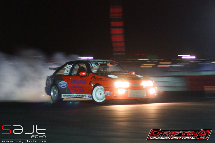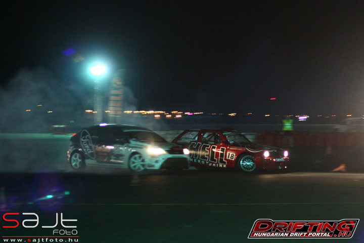 Meglepetésre az amúgy jól teljesítő Lakatos Zoltán is kiesett az első páros küzdelmek során. A második körben hibázott Galacs Gábor ellenében, így a folytatásban csupán az égiekben bízhatott, hogy bajnoki elsőségét ne háborgassa senki. Talán meghallgatták imáit, mivel az eső váltakozó intenzitással viccelte meg a pilótákat. A pálya megvilágítását pedig a nagyteljesítményű reflektorok mellett stroboszkópként beillő villámlások is segítették. Szükség is volt rá, mivel Varga Tamás „Puci” besokallt Szili Krisztiánnal vívott csatájában és az egyik világítóoszlopot kidöntötte. A technikai szünet azonban épp kapóra jött a Gymkhana szakágban jeleskedő versenyzőknek, rögtönzött bemutatójukkal az eső elálltjával igen gyorsan füstbe borították a nézőteret. A Top16-os küzdelmek egyik kiemelkedő csatáját Zentai Attila és Szántó Nikolett vívta a Z4-es BMW-vel. Csupán többszöri visszahívás után dőlt el, hogy az „erősebbik” nem képviselője készülhet a folytatásra. Niki tőle szokatlan agresszióval támadta ellenfelét és elől haladóként sem spórolt a szögekkel. Bár egyelőre nem került kihirdetésre a Federal különdíj, de akár esélyesként is felvetődhet Niki neve a bírák elméjében. [BANNER type="1"] A legjobb 8 páros csatái is bővelkedtek izgalmakban. Szili Krisztián higgadt kiegyensúlyozott teljesítménnyel tovább menetelt egészen az elődöntőkig. Varga Tamás „Puci”, majd Galacs Gábor kiverésével a döntőbe jutás párharcát is megnyerte Zalabai Zsolt ellen. Pedig Zsoltnak sem voltak kis trófeái: a nitrós E36-al versenyző Grózinger Zsoltot, majd a tavalyi Gymkhana bajnokot Zahuczki Zsoltot búcsúztatta. A másik ágon Zentai Sándor, Niki látványos csatában kiverését követően, elvérzett a Hell Racing Team versenyzője György Szilveszter ellen. Követőként túlzottan ráautózott az utolsó kanyarban, a sebességkülönbség hatására pedig nekiment és kizökkentette Szilvesztert, ami mindkettőjük beforgását eredményezte. A vesztes csatát követően Sanyi testvére Attila vehetett revansot, aki a negyeddöntő előtt az egyre jobb formában versenyző Smidéliusz Bálintot gyűrte le. A Zentai csapat visszavágója jól sikerült, mivel Attila az ismét szakadó esőben nagyon meggyőzően és szinte hiba nélkül tudott fölényt kovácsolni György Szilveszter ellen.