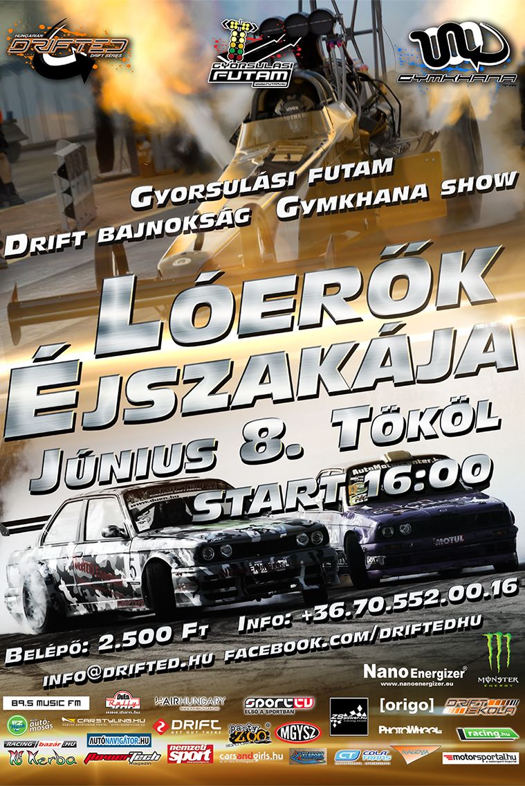 A várakozásoknak megfelelően idén is több ezer ember volt kíváncsi hazánk egyetlen tököli éjszakai autós rendezvényére, a Lóerők Éjszakájára, ahol a viszontagságos időjárás ellenére három szakág - a drift, gymkhana és a gyorsulási versenyek - szerelmesei gyűltek össze. A meteorológusok nem vicceltek, esővel fenyegettek, s valóban bejött számításuk, éjfél előtt nem sokkal villámverések közepette leszakadt az ég, ami a rendezvény végét is jelentette egyben. A grandiózus végkifejlet ellenére a nézők elégedetten térhettek haza, ugyanis az események sokasága látványban újra meggyőző volt.