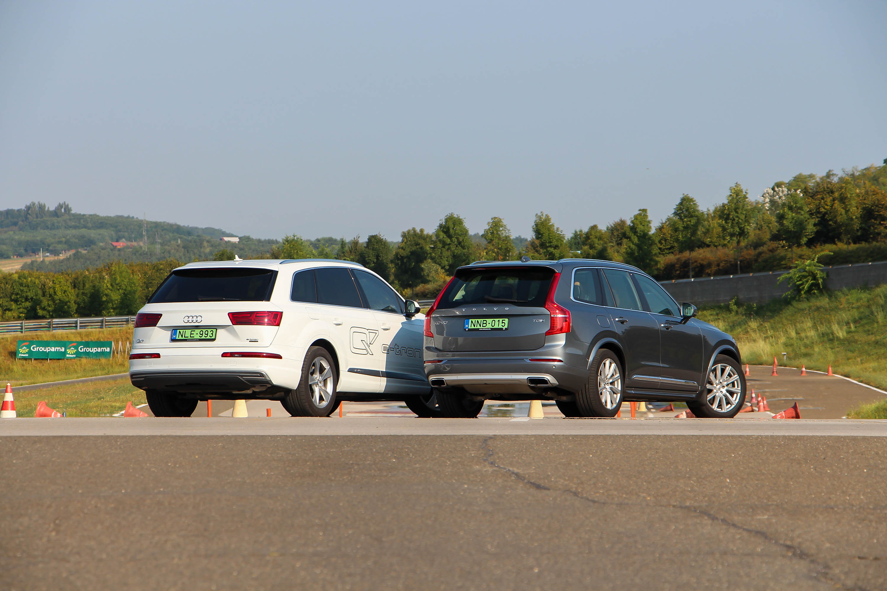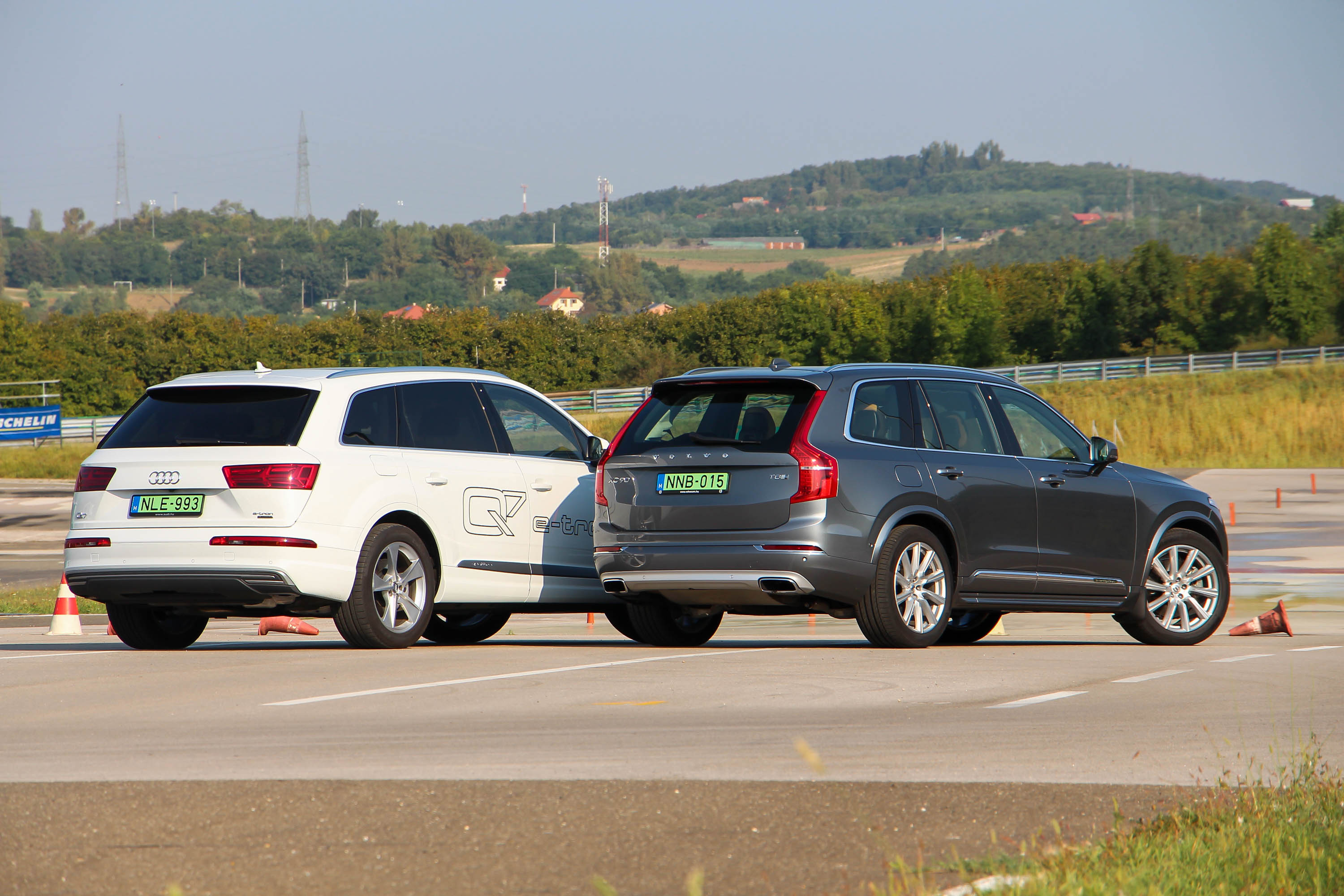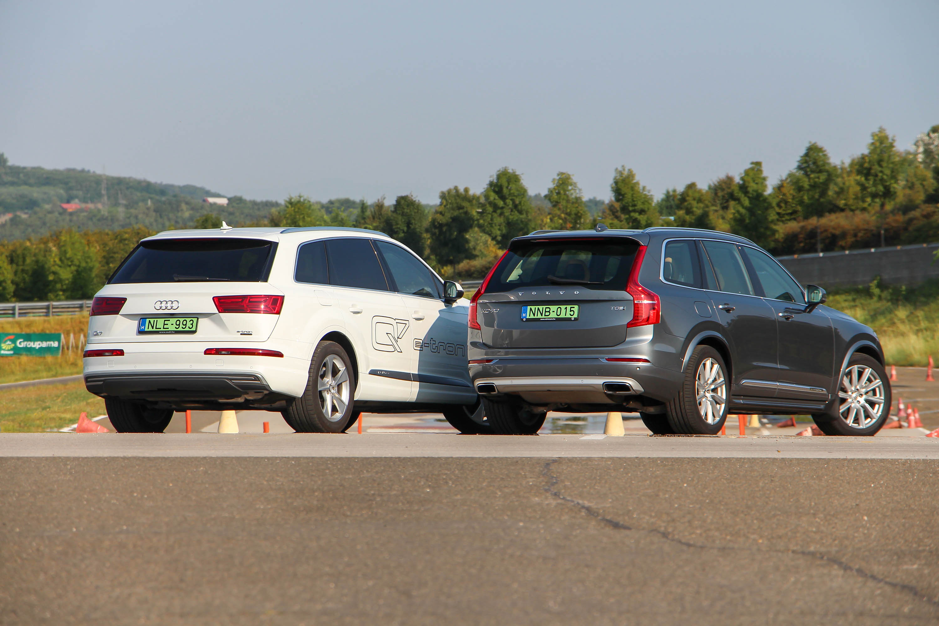 Viszont a Q7 mindenképp sokkalta jobb hatótávot tud (könnyedén 1000 kilométer felettit, míg a Volvónál az 500 km is csoda), ha tehát nem kell a hatodik, hetedik ülés, a legtöbb szempont szerint sokkalta jobb autót kapunk a négykarikásoktól. A szimpátia, valamint az egyedi ajánlat kérdése persze mindenkinél másképp adódik. Aki ilyet venne, próbálja ki mindkettőt, kérjen ajánlatot, ne feledje, hogy ott a szintén zöld rendszámos BMW X5 is, de egyet kérünk, senki se gondolja, hogy ezek - az esetlen hazai törvényi szabályzáson túl - környezetkímélő autók. Továbbá bármelyiket is vegye, hajtsa ésszel és nagy óvatossággal, mert lehet ám velük jókorát esni, amit nem közúton, hanem ahogyan mi is tettük, tanpályán érdemes kipróbálni.Jobb, de extrázva érezhetően drágább az Audi. Utóbbi tovább mehet árammal, kényelmesebb, csendesebb, a Volvo viszont hétüléses is lehet